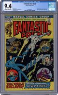 The Silver Surfer and Galactus guest star in "This World Enslaved! " Part 4 of 4 . Script by Stan Lee. Pencils by John Buscema. Inks by Joe Sinnott. Cover by Sal Buscema. With a bold maneuver, Reed Richards turns the tables on the Devourer of Worlds! After sneaking onboard Galactus' starship, Mr. Fantastic threatens to destroy it unless the cosmic Ravager departs from Earth immediately! Will Reed's gallant gamble succeed? Possibly so, but first Mr. Fantastic has to convince the Silver Surfer, Agatha Harkness, General Thunderbolt Ross, and President Richard Nixon to trust him! The FF are going "all in" vs. Galactus! Will it be blackjack or bust? Cameo appearance by Franklin. (Notes: Galactus appears next in Thor 225. The Fantastic Four tangle with Galactus again in FF 172 thru 175. This four-part story was reprinted in Marvel Treasury Edition 21. The letters page includes a letter from comics editor David McDonnell. This issue includes a full-page ad for the first issue of the Hero For Hire series, later renamed Power Man and Iron Fist.) 36 pgs. Cover price $0.20. Grade: CGC 9.4 explanation of grade Condition: Used (collectible)