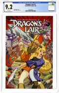 Andy Mangels (w), Fabio Laguna (p & i), Tony Washington (c) Celebrating the 20th Anniversary of Dragon's Lair, the stars of one of the top arcade games in history make their comic book debut! Swearing revenge on Dirk the Daring for killing his offspring, the deadly dragon Singe swoops up Princess Daphne in his razor- sharp claws! Now, armed with his courage and skills, our brave knight must survive the dangers of the Dark Kingdom to save his Princess! It's swordplay, sorcery, dragons, and damsels...plus a pinch of humor! Lead on, adventurer...your quest awaits! 32 pgs, full color, on sale August 6 $2.95 Cover price $2.95. Grade: CGC 9.2 explanation of grade Condition: Used (collectible)