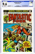 "Thundra at Dawn!" Guest-starring Thundra. Plot by Roy Thomas. Script by Gerry Conway. Pencils by Ramona Fradon. Inks by Joe Sinnott. Cover by John Buscema and Joe Sinnott. It's New Year's Eve in Times Square! Everyone is in a celebratory mood, except the Fantastic Four. Affairs of the heart are plaguing both Reed and Johnny, while Ben and his girlfriend Alicia are doing great! However, the Thing's fortunes change in a New York minute, when Thundra dramatically reappears at the stroke of midnight, challenges Ben to a fight, and kidnaps Alicia! What a set of revoltin' developments! The colossal confrontation between the two mighty warriors begins at Shea Stadium and ends at the Unisphere (from the 1964 World's Fair)! Can the blue-eyed idol of millions find the inner strength to bring down (the) Thundra? Cameo appearances by Captain America, the Hulk, Iron Man, Power Man, Spider-Man, Thor, Sandman, Trapster, and Wizard. (Notes: This is one of the very few issues that Ramona Fradon drew for Marvel. Gerry Conway begins his 20-issue scripting run on the Fantastic Four series. Thundra appears next in Giant-Size Super-Stars 1.) 36 pages Cover price $0.20. Grade: CGC 9.6 explanation of grade Condition: Used (collectible)
