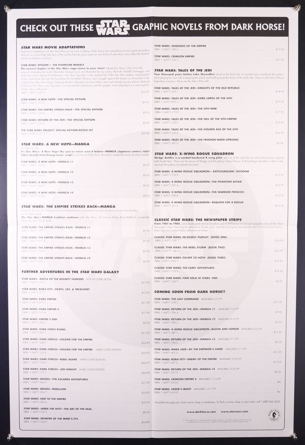 Reverse features a list of Dark Horse Star Wars comics. Poster is folded as originally issued. Hight quality print on poster stock. 24" x 36".