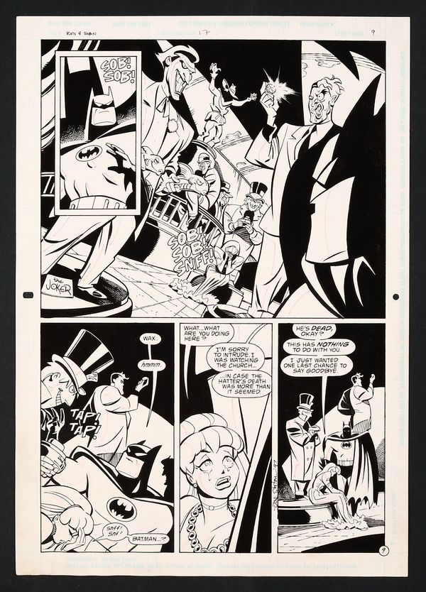 A fantastic page from a standout issue! Jervis Tetch, the Mad Hatter, has seemingly died of 'a broken heart' after hearing the news that Alice Pleasance, the object of his obsession, is getting married. Surprisingly, Alice reacts poorly to the death and leaves her groom at the altar. Batman follows and finds Alice in a closed wax museum that houses a gallery of Gotham's rogues! Pencil and ink on DC Comics art board. 11 1/2" x 16 1/2". NOTE: Page displays some moisture damage to the lower portion with some warping and discoloration which is only visible on the reverse.