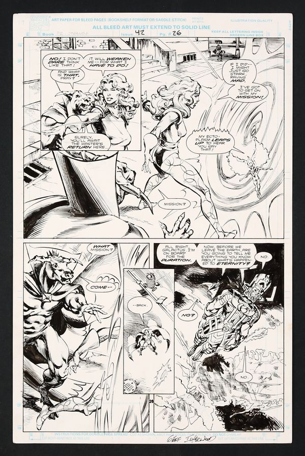 An Infinity War crossover! Rintrah is unexpectedly left on his own as Clea hops into a portal on an unknown mission while we Doctor Strange has already left with Galactus! Rich, beautiful work by Isherwood here, especially on Clea and Rintrah in the inset first panel! Signed by the artist in lower margin. Pencil and ink on Marvel Comics art board. 11 1/4" x 17 1/4".