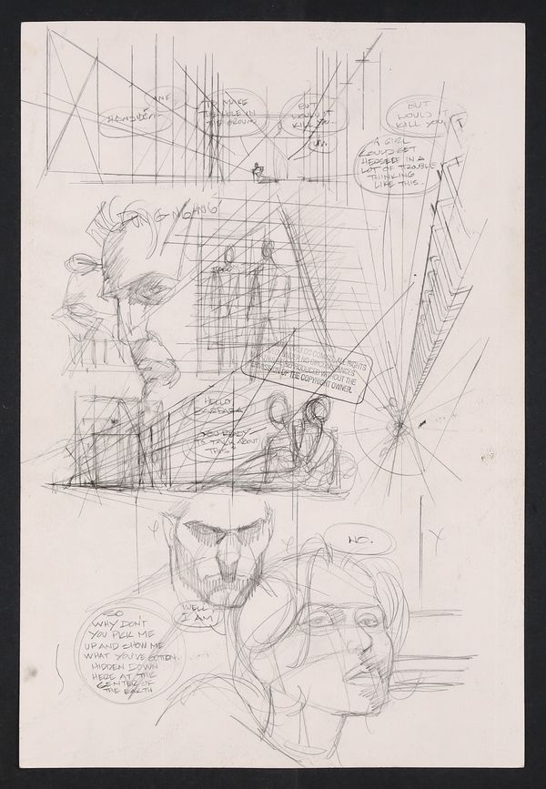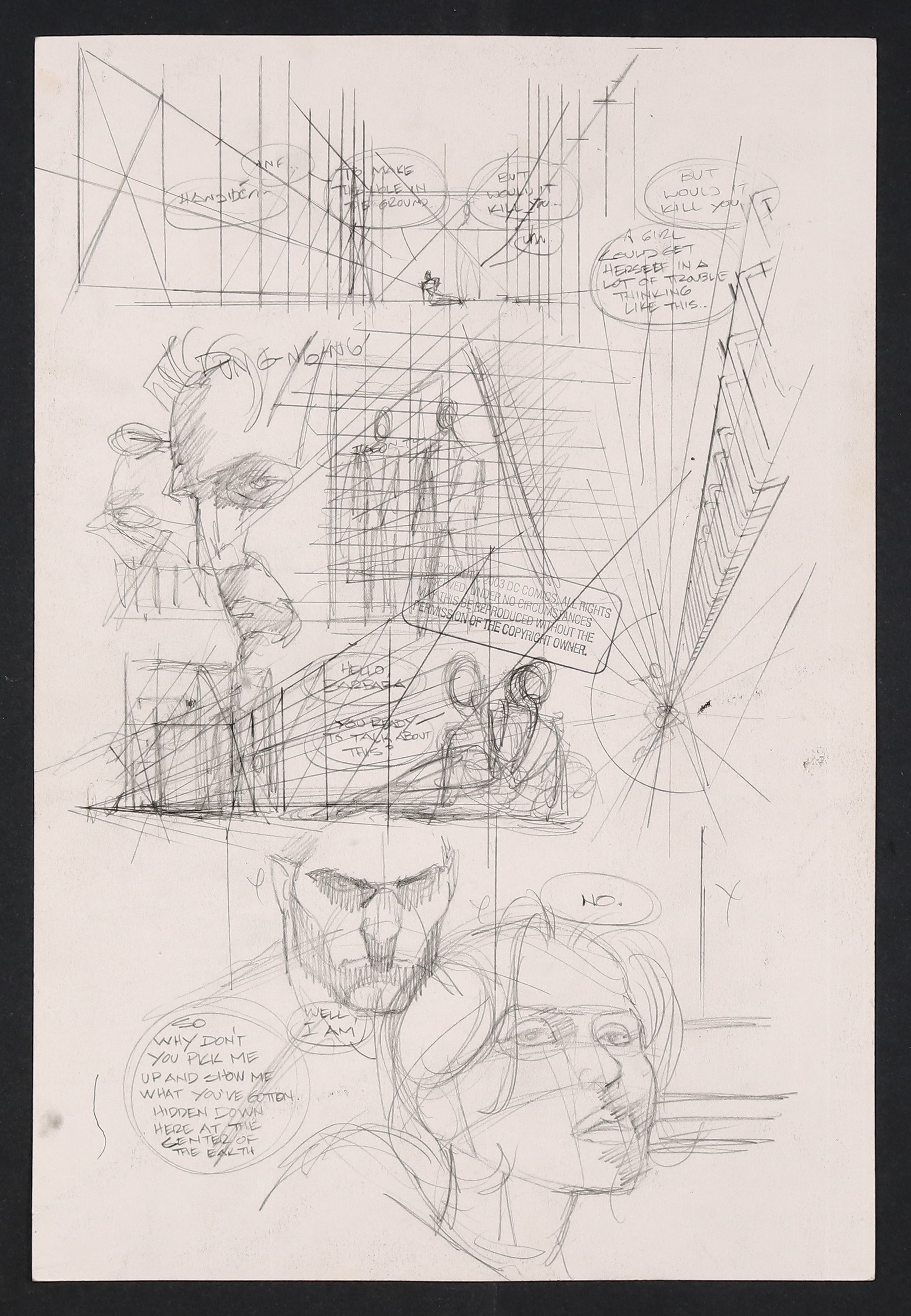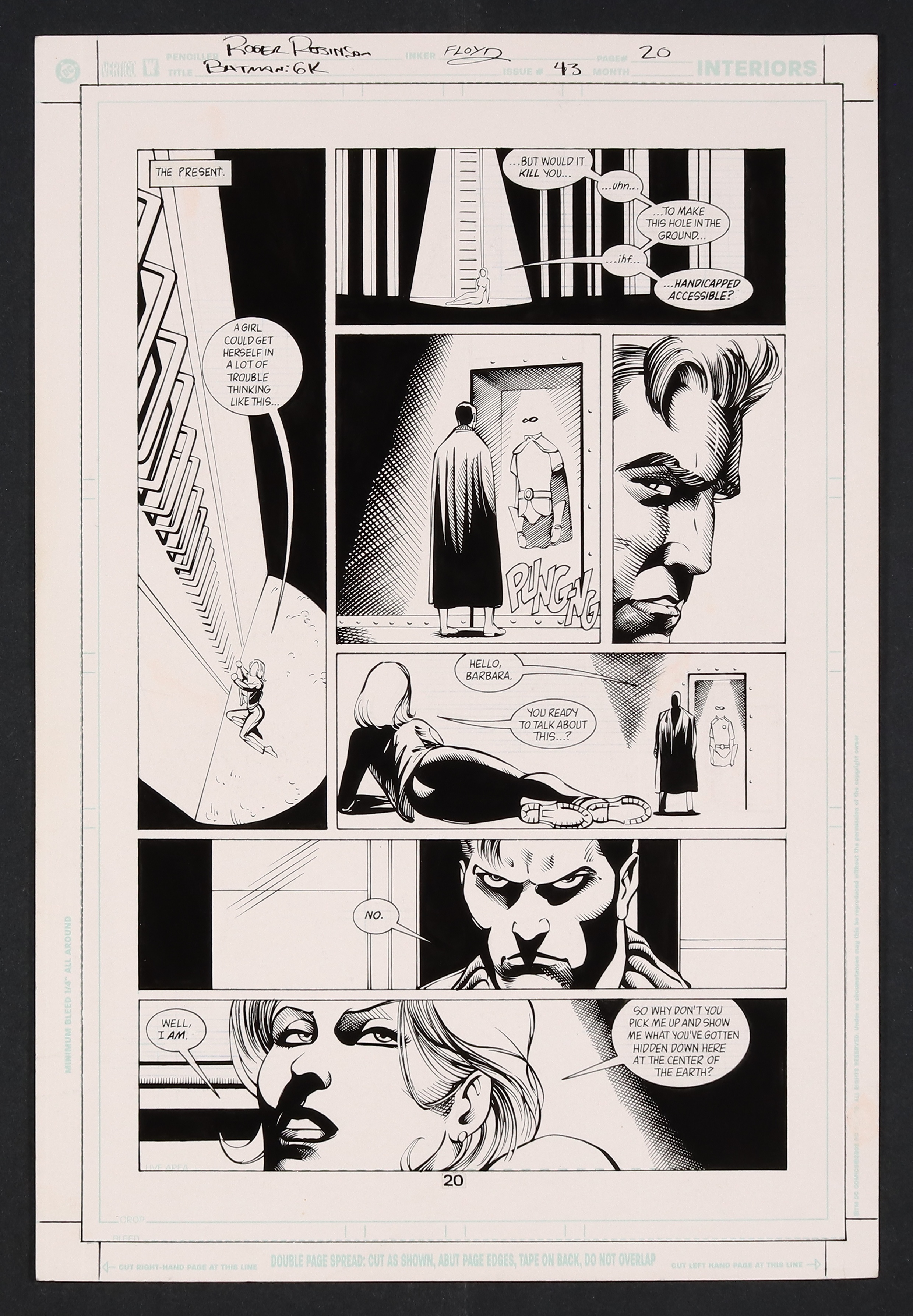 An absolutely brilliant page from this story about Jason Todd's death coming back to haunt Batman! As Bruce moodily ponders his shrine to Jason Barbara Gordon appears behind him, sandwiching Bruce between the consequences that come with allowing others to put on the mask. Robinson and Floyd are firing on all cylinders here from the blocking and framing of the scene to the expressive faces on our heroes. Pencil and ink on DC Comics art board. 11 1/4" X 17".