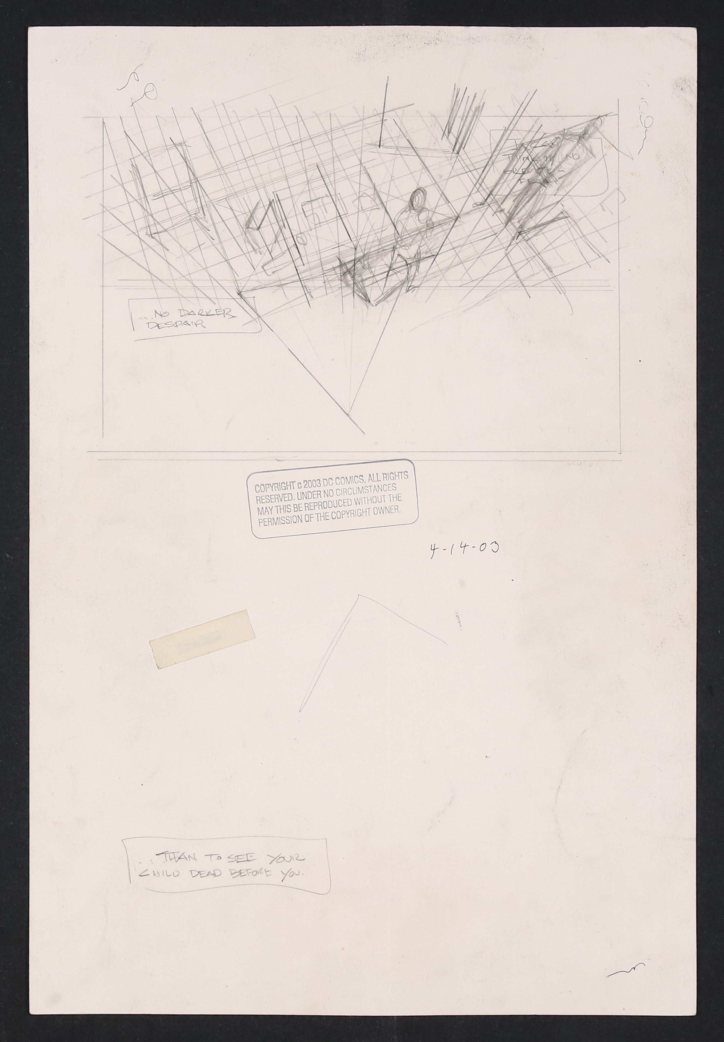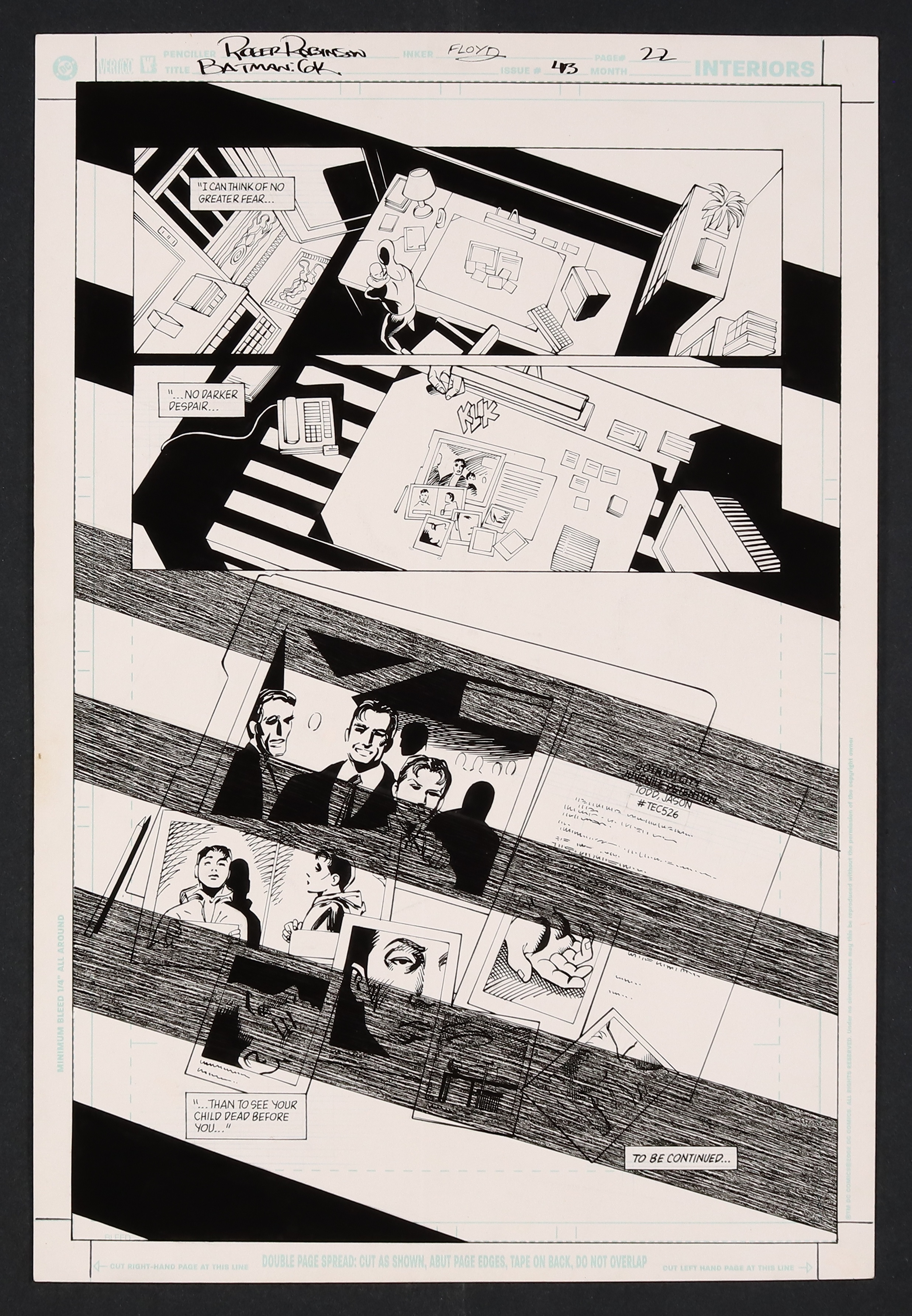 As the captions continue Barbara Gordon's words to Bruce about whether he was a good 'father' to Jason, we cut to a wonderfully noir-infused scene of the evidence collected by the police officer looking into Bruce Wayne's possible involvement in Jason's death. Pencil and ink on DC Comics art board. 11 1/4" X 17"