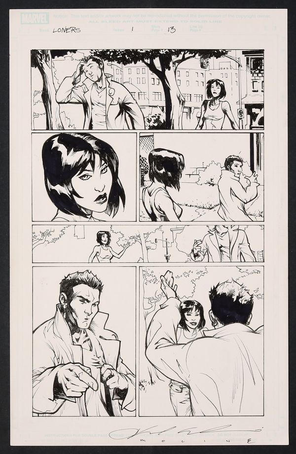 An interesting series penned by the future EiC of Marvel Comics CB Cebulski, Loners followed a support group made up of former heroes trying to put their powers behind them. Here we catch up with Mattie Franklin (Spider Woman) and Chris Powell (Darkhawk) outside of the meeting where Mattie reveals to Chris that she's NOT trying to give up the hero game and in fact needs his help to take down an MGH operation! Signed by Moline in the lower margin. Pencil and ink on Marvel Comics art board. 11" x 17 1/4".