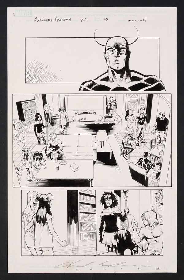 The Runaways meet the students of Avengers Academy! In the aftermath of a classic superhero misunderstanding that turns into a fight, the two groups of young heroes tensely mill about under the gaze of Hank Pym! Signed by Moline in lower margin. Pencil and ink on Marvel Comics art board. 11" x 17 1/4".