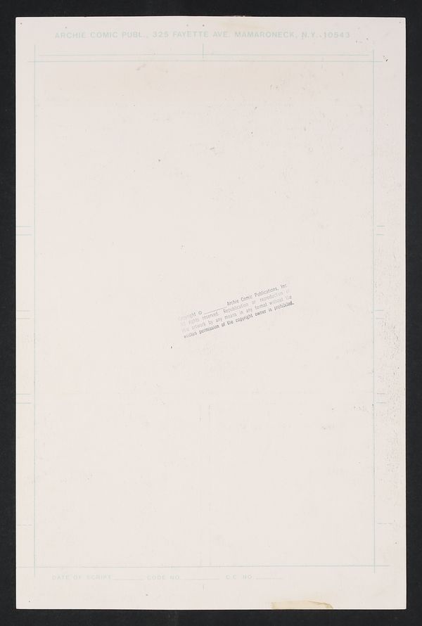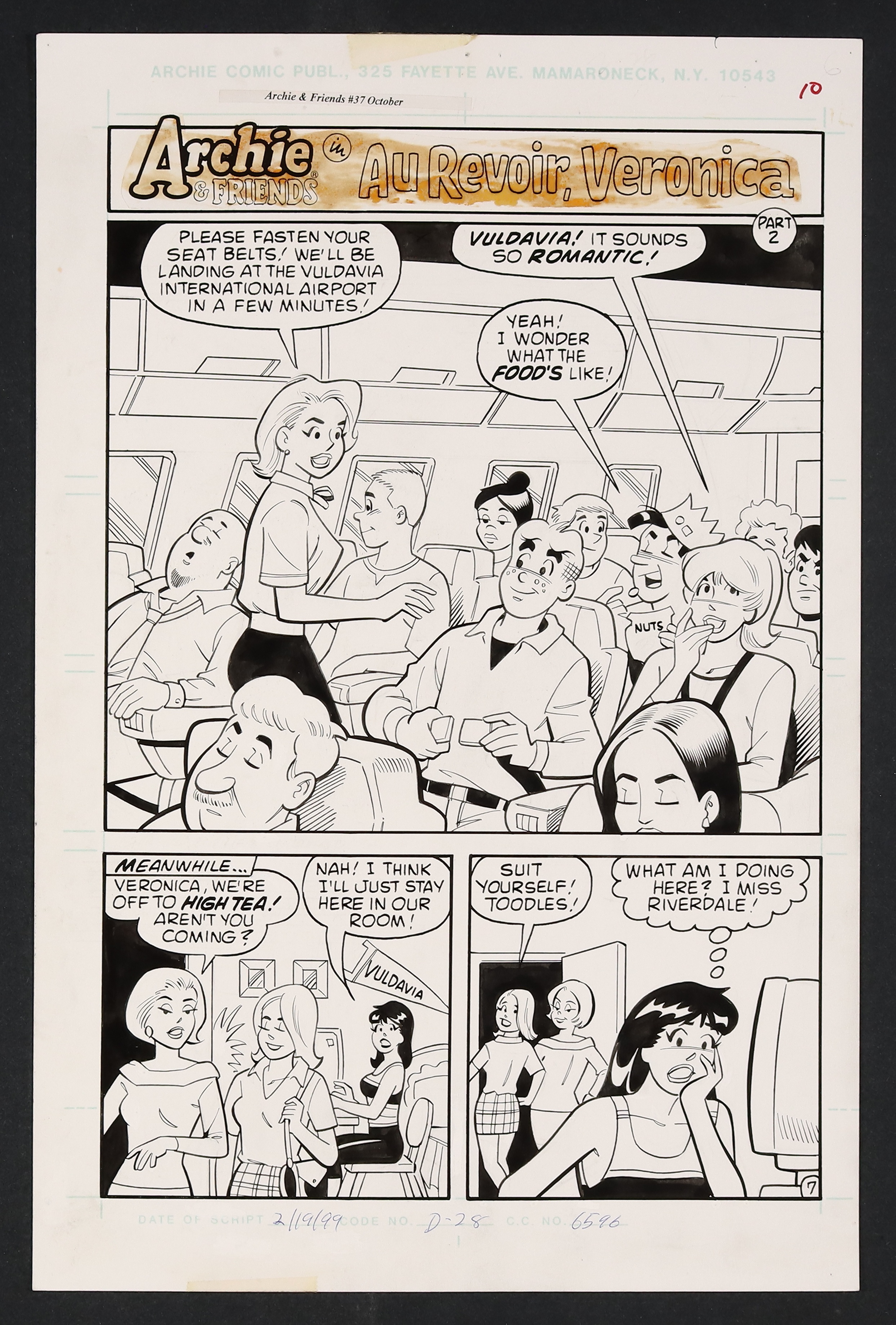 After a tiff with the gang and some urging from her country club friends, Veronica decides to go to boarding school in Europe (Vuldavia, to be precise). Of course, the gang can't stand that and head out to convince her to come home- though it might not take that much convincing! Pencil and ink on Archie Comics art board. 11 1/2" x 17 1/2".