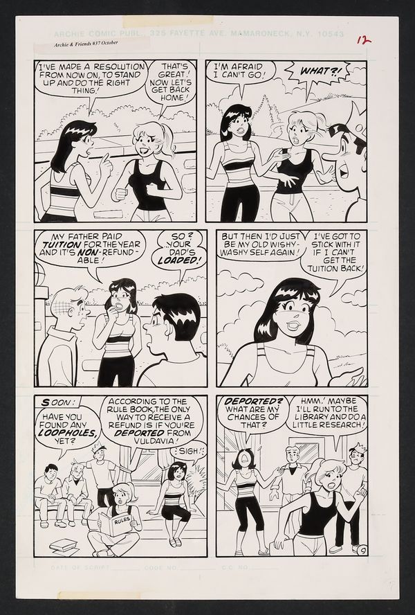 Now that Veronica has reconsidered her rash decision to attend a European boarding school (with the help of her friends, of course) she needs to figure out how to get back home- with her dignity intact. Pencil and ink on Archie Comics art board. 11 1/2" x 17 1/2".