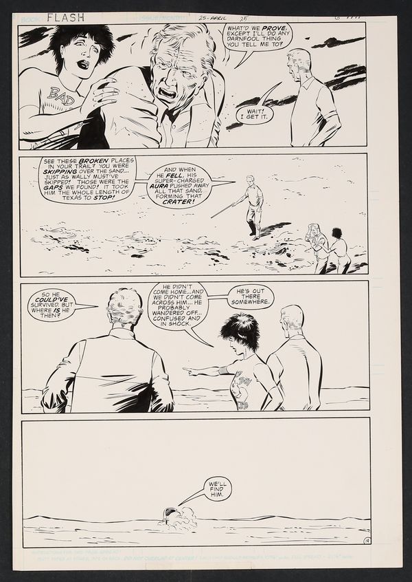 Our team of three intrepid investigators (Tina, Mason, and Jerry- formerly known as Speed Demon!) are hot on the trail of an out-of-control Flash when they find signs of him in the Texas desert. With hopes high that this mystery will not end with the finding the Flash's corpse, they set off once more. Pencil and ink on DC comics art board. 11 1/4" X 16".