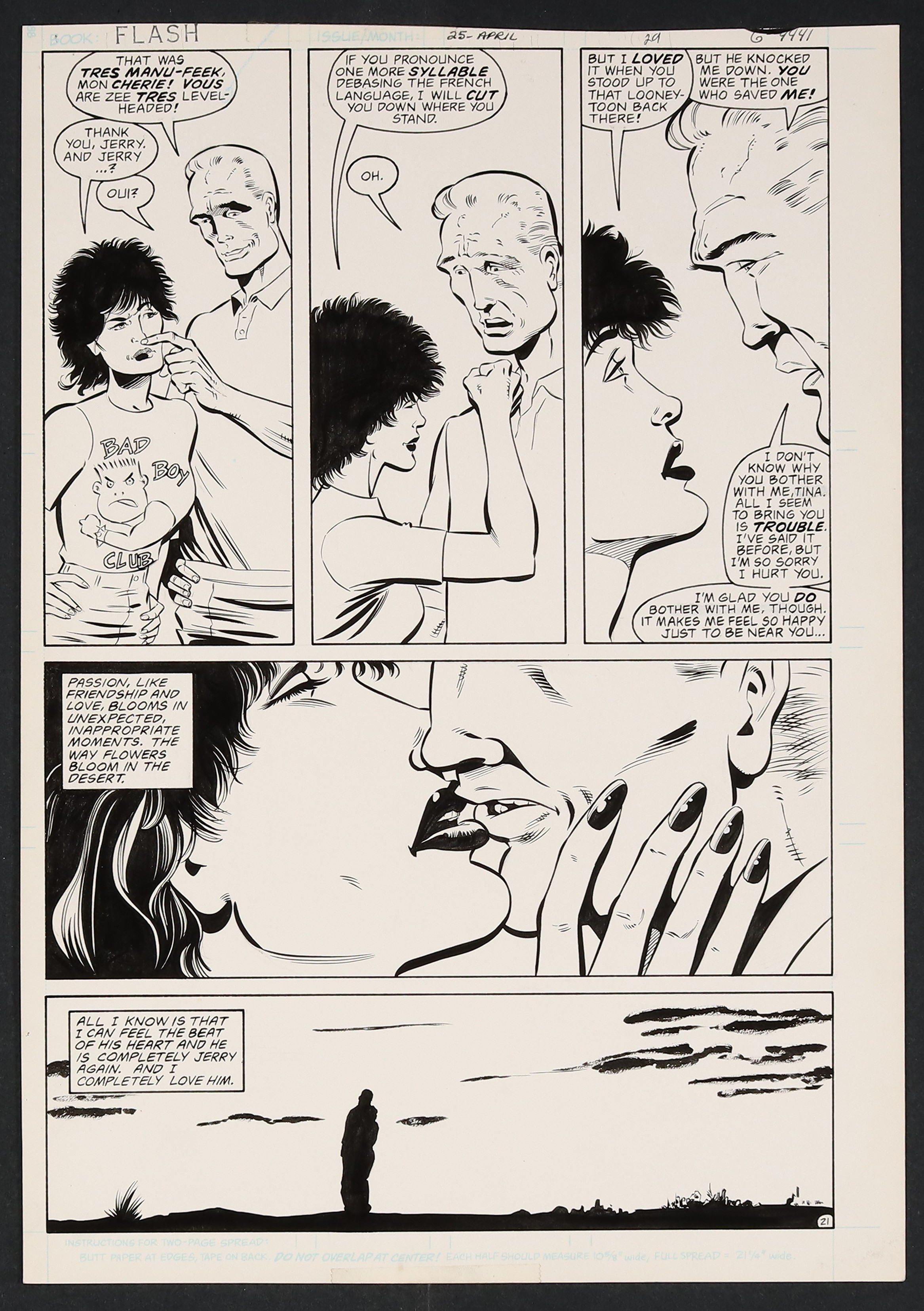 There's nothing like the forced togetherness of a road trip to rekindle an old flame! While trying to track down and out-of-control Flash, Tina and Jerry (formerly Speed Demon!) share a tender moment in the desert. Pencil and ink on DC comics art board. 11 1/4" X 16".