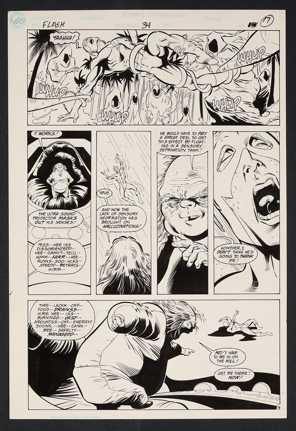 Trapped in a sensory deprivation room by the Turtle in this story aptly title "White Out", Wally begins to hallucinate new friends, old enemies, and even Barry Allen! A great first panel of Flash being torn at by unknown horrors is juxtaposed well with the third panel where we see him flailing on the floor alone like a bug. Pencil and ink on DC comics art board. 11" X 16 1/4".