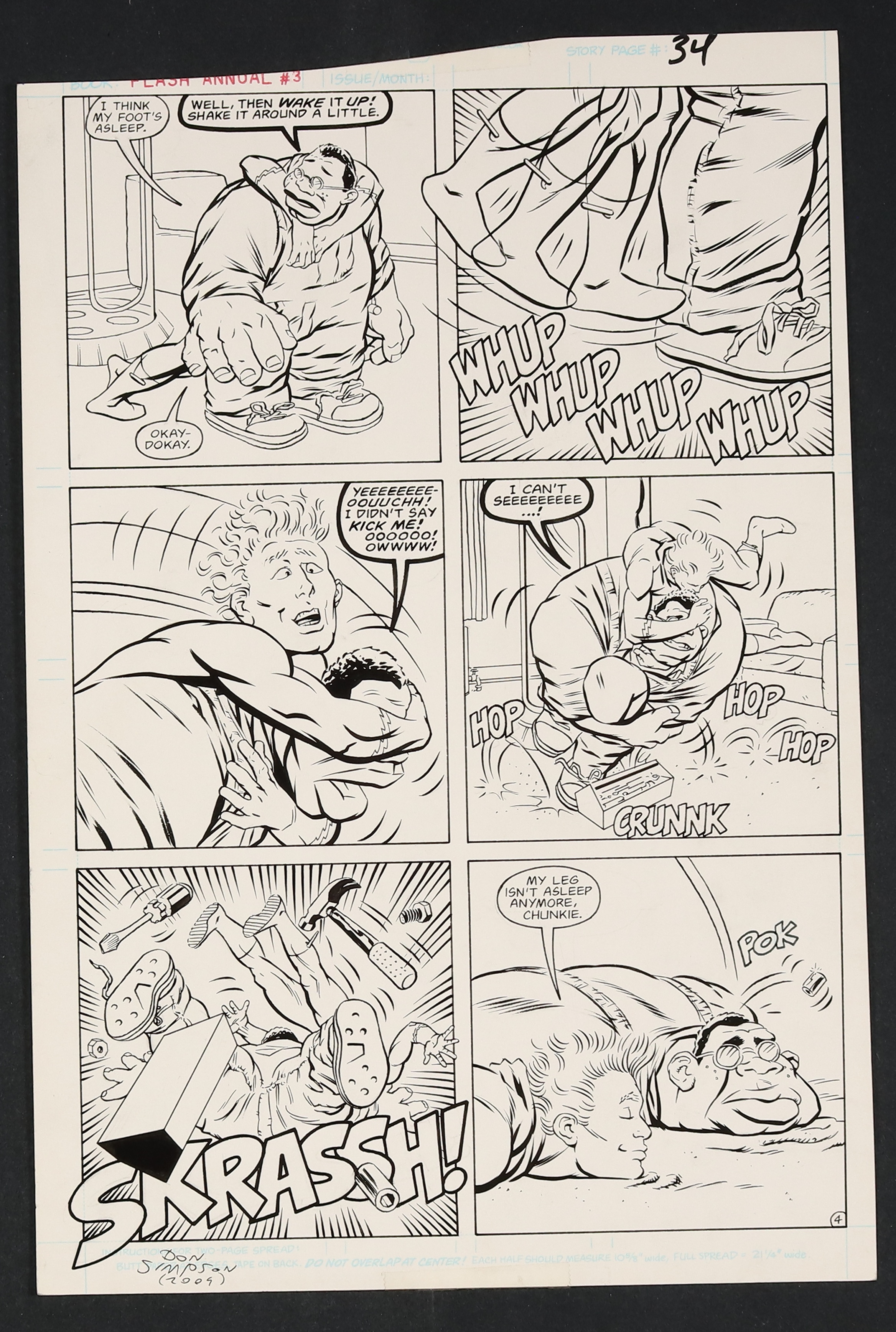 From "A Chunk at the JLI!" Chunk and Wally attempt to build the Flash's Matter Transferal Tube but, due to an error while using Bart Sturm's Amplifying helmet, Wally's brain is fried. What follows is a light hearted, slapstick story where our two heroes ruin the day of a certain Green Lantern. Fantastic work on this page the great Simpson who's very much in his element with this story. Also included is Simpson's full-sized prelim for the page. Final page is pencil and ink on DC comics art board and measures 11" X 16 1/4", prelim page pencil and ink on paper and measures 12" x 19". Both pages are signed by Simpson in the lower right. Prelim page is folded.