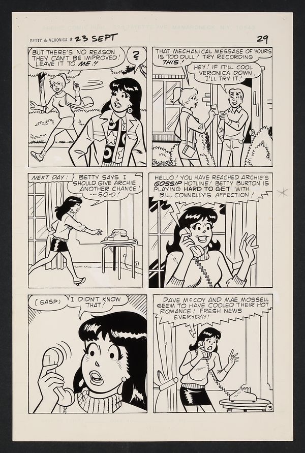 Veronica is furious after calling Archie and getting his answering machine (she refuses to talk to machines), Betty comes up with an absolute ingenious solution to the problem! Pencil and ink on Archie Comics art board. 11 1/2" x 17 1/2".