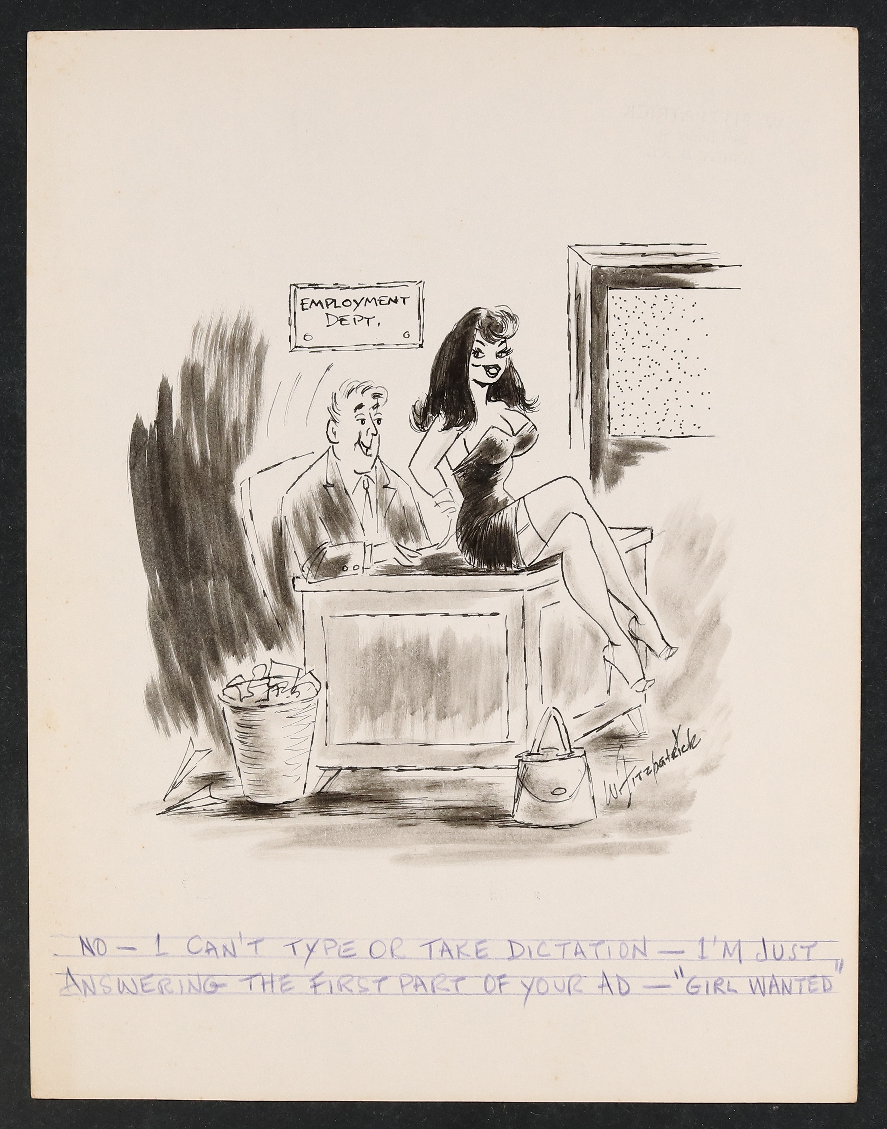 While the place of publication for this piece is unknown, Fitzpatrick was a prolific cartoonist contributing mainly to various Humorama publications like Jest and Gaze in the 50's and early 60's. Signed by the artist. Pencil and ink on paper. 8 1/2" x 11".