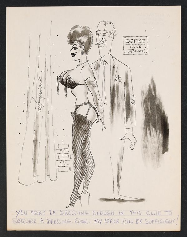 While the place of publication for this piece is unknown, Fitzpatrick was a prolific cartoonist contributing mainly to various Humorama publications like Jest and Gaze in the 50's and early 60's. Signed by the artist. Pencil and ink on paper. 8 1/2" x 11".
