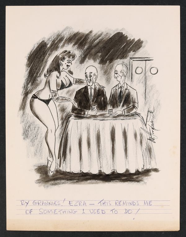 While the place of publication for this piece is unknown, Fitzpatrick was a prolific cartoonist contributing mainly to various Humorama publications like Jest and Gaze in the 50's and early 60's. Signed by the artist. Pencil and ink on heavy paper stock. 8 1/2" x 11".