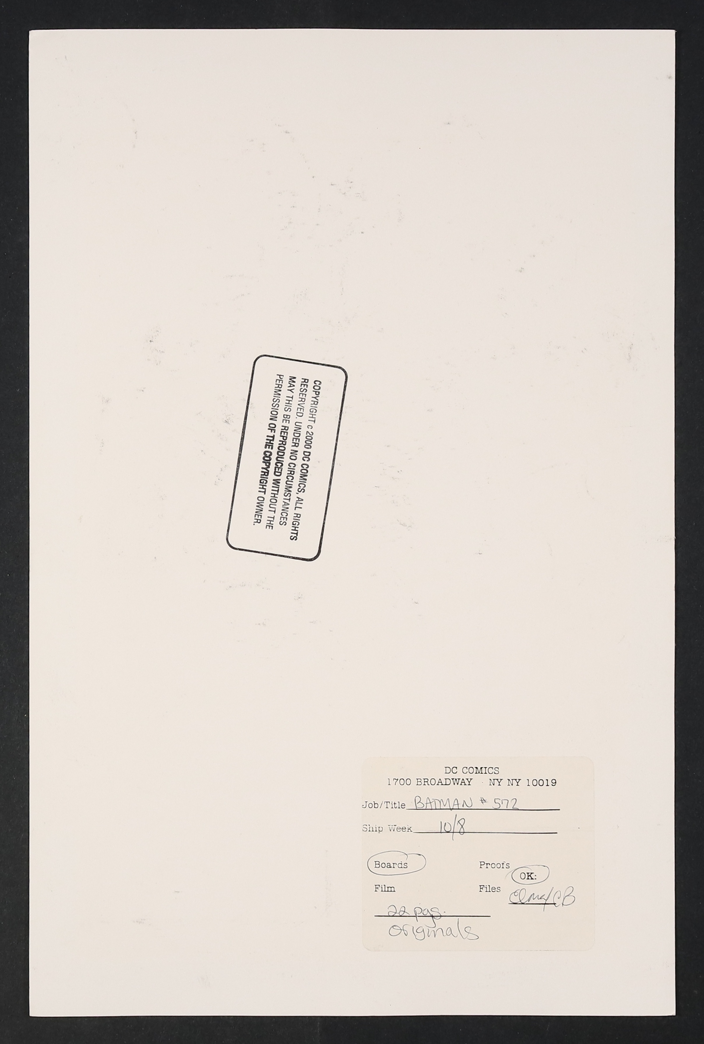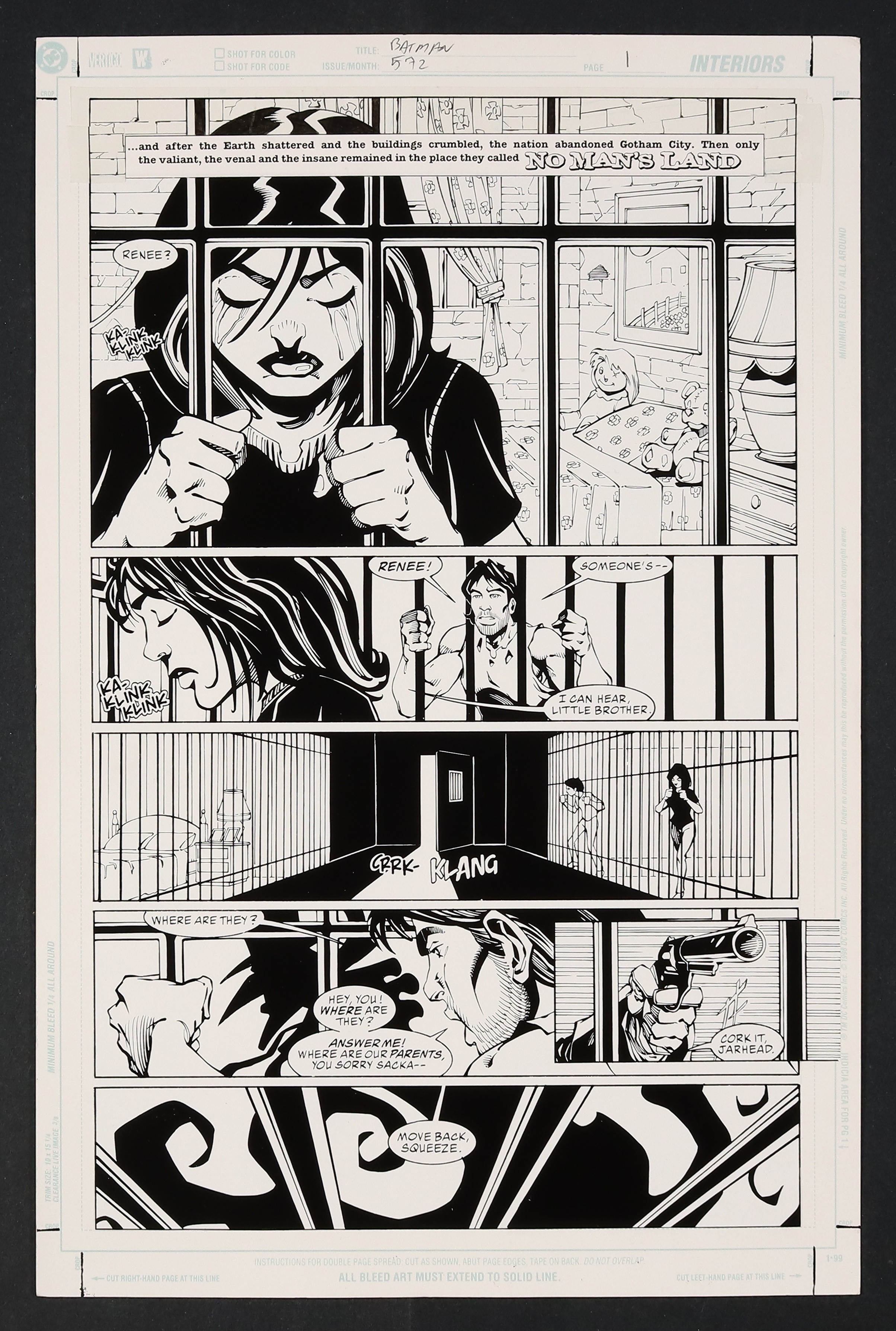 Renee Montoya and her brother are being kept prisoner in this No Mans Land story. The cell, with its flowery bed spread and stuffed animals, shows an attempt to give her confinement a more homily feel- does her captor...care for her? Printed stat on DC comics art board. 11 1/4" x 17". NOTE: The art on this page is ENTIRELY made up of a printed stat with the exception of the top inch around the framing copy. It is likely a final proof that required more editing at the last second.