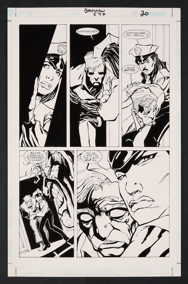 The psychological thriller that is the Renee Montoya and Two-Face subplot of No Man's Land comes to a head here as the defendant for Two-Face's trial is revealed to be none other than Commissioner Jim Gordon! Pencil and ink on DC Comics art board. 11 1/4" X 17".