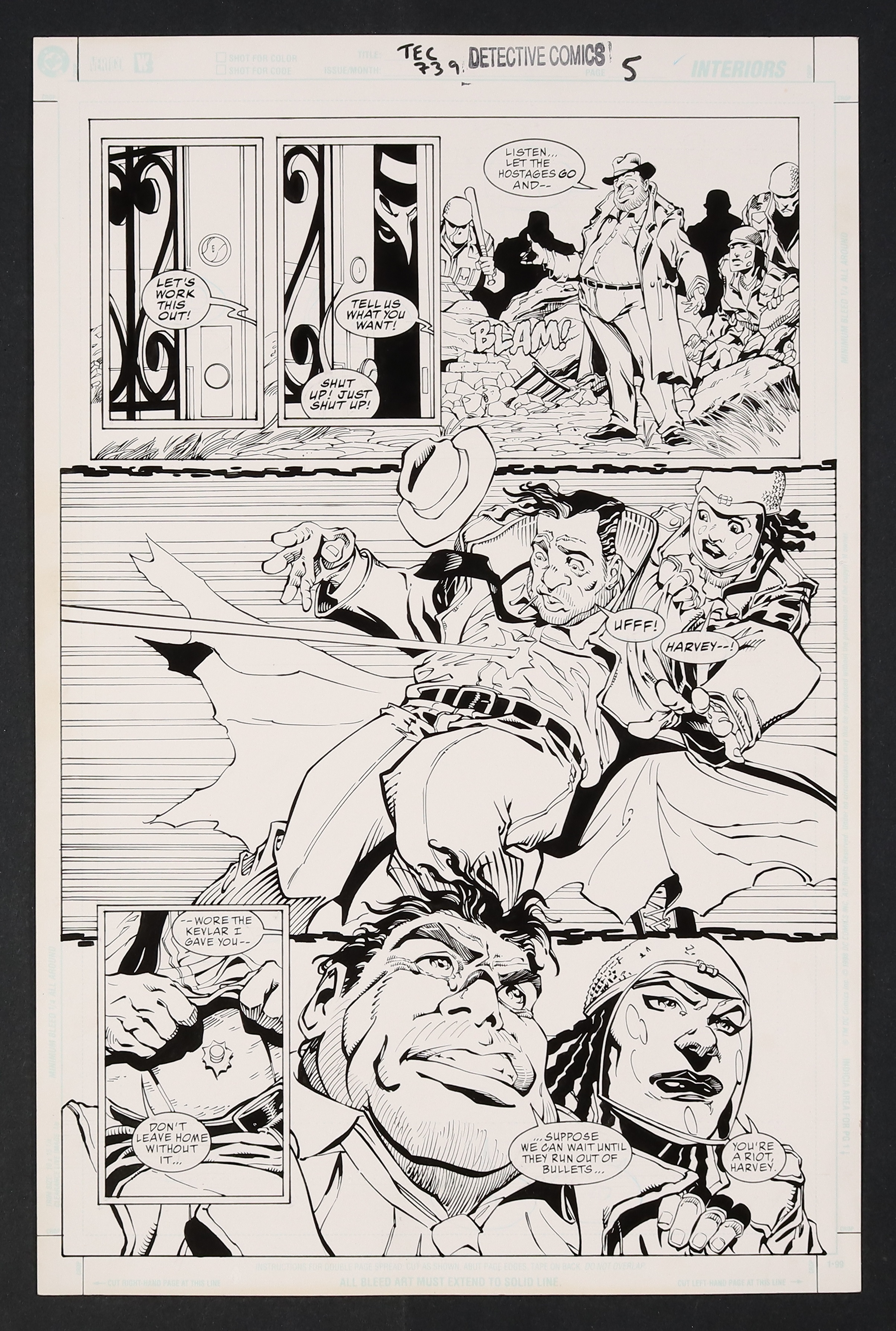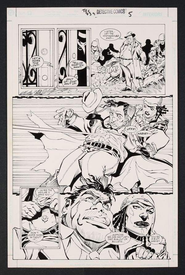 Harvey Bullock, master negotiator, puts his skills to the test in this dynamic page- unfortunately things don't go his way as he is promptly shot in the chest! Good thing he wore the Kevlar. Pencil and ink on DC Comics art board. 11 1/4" X 17".