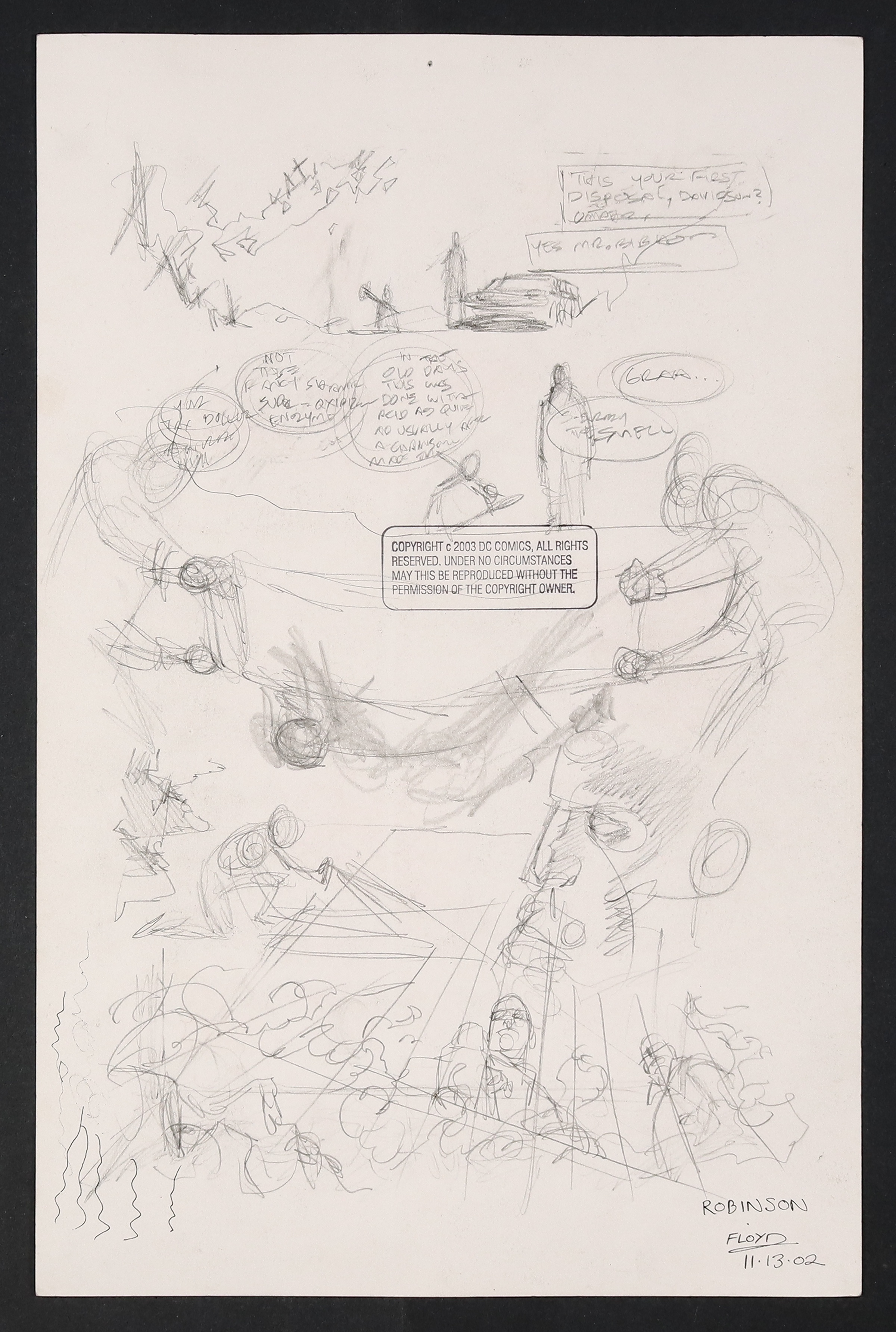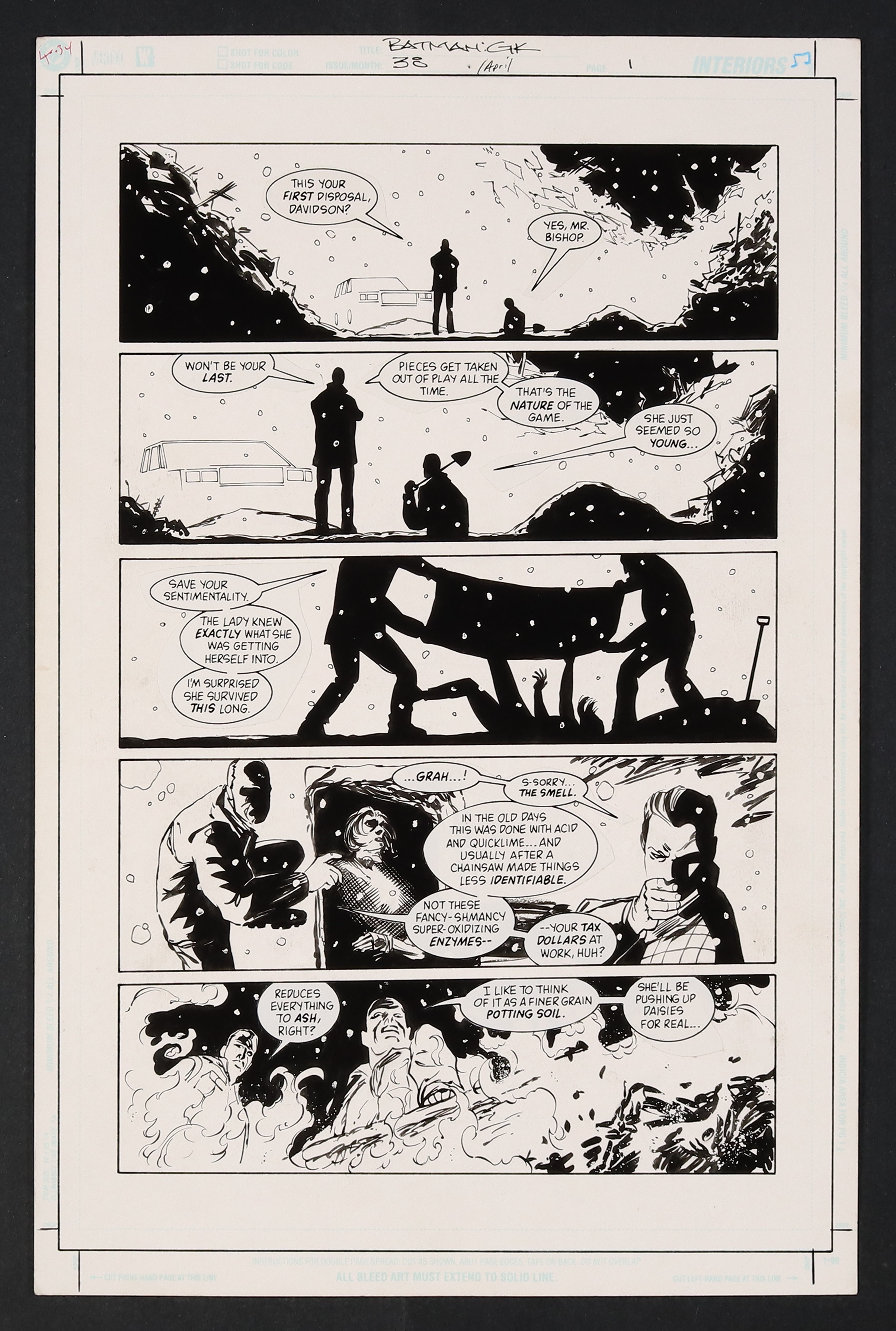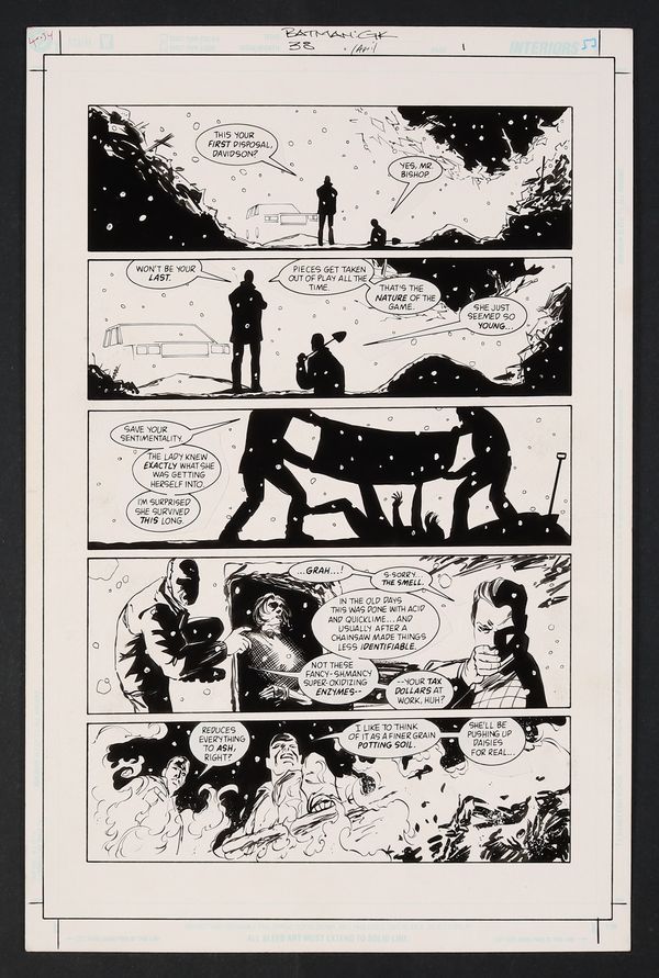 A grim opening page as two shadowy figures casually dispose of a body- though judging by the "--your tax dollars at work, huh?" line these aren't your run of the mill Gotham criminals! Pencil and ink on DC Comics art board. 11 1/4" X 17".