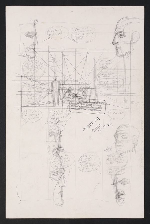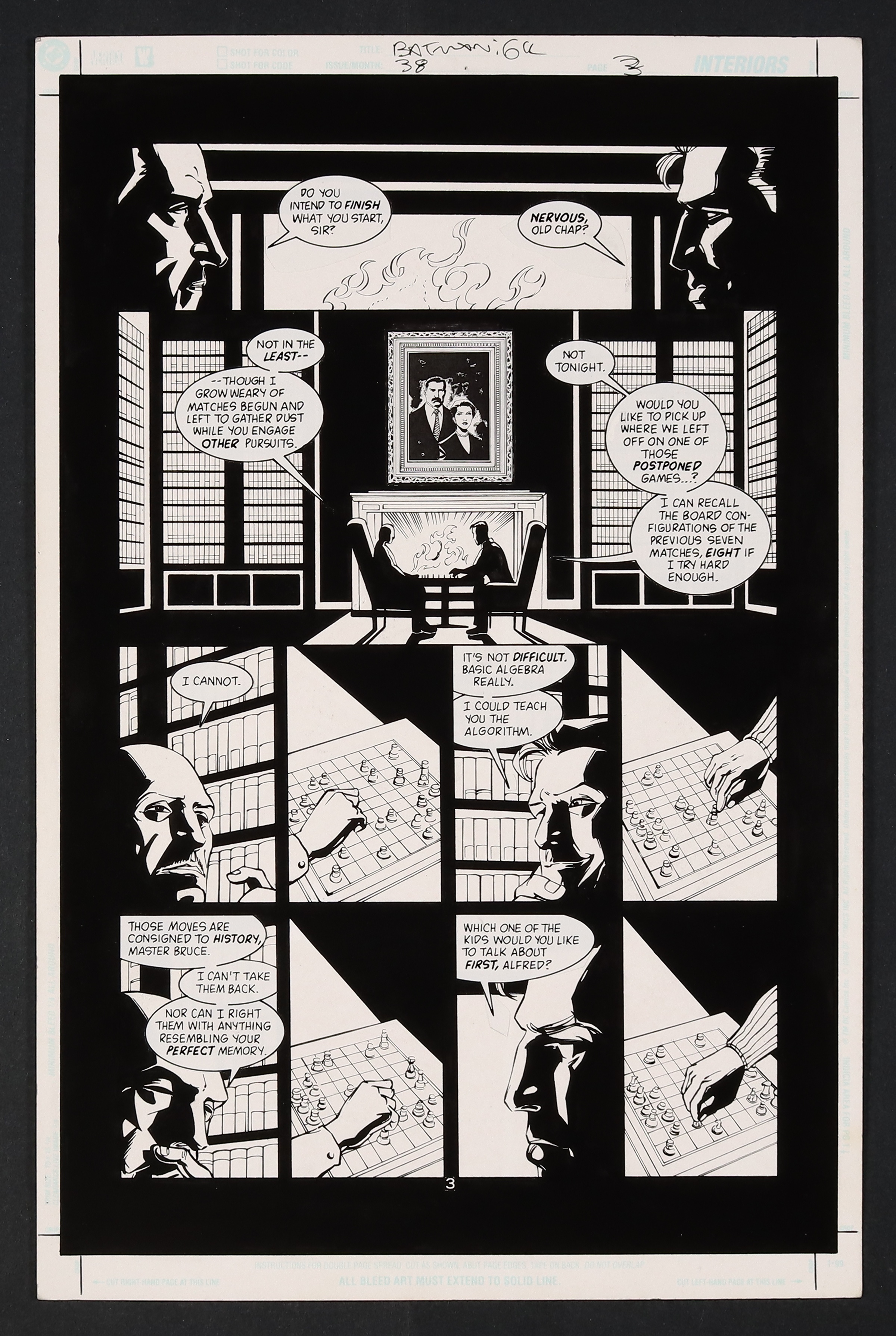 Surprising both Alfred and the reader, Bruce Wayne has decided to have a quiet evening at home with his trusty butler playing chess. Of course, as in most fiction chess isn't just chess as Alfred makes the true opening move and asks Bruce which of the 'kids' he wants to talk about first. Pencil and ink on DC Comics art board. 11 1/4" X 17".