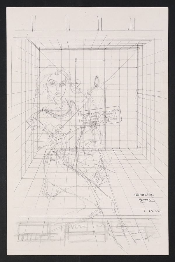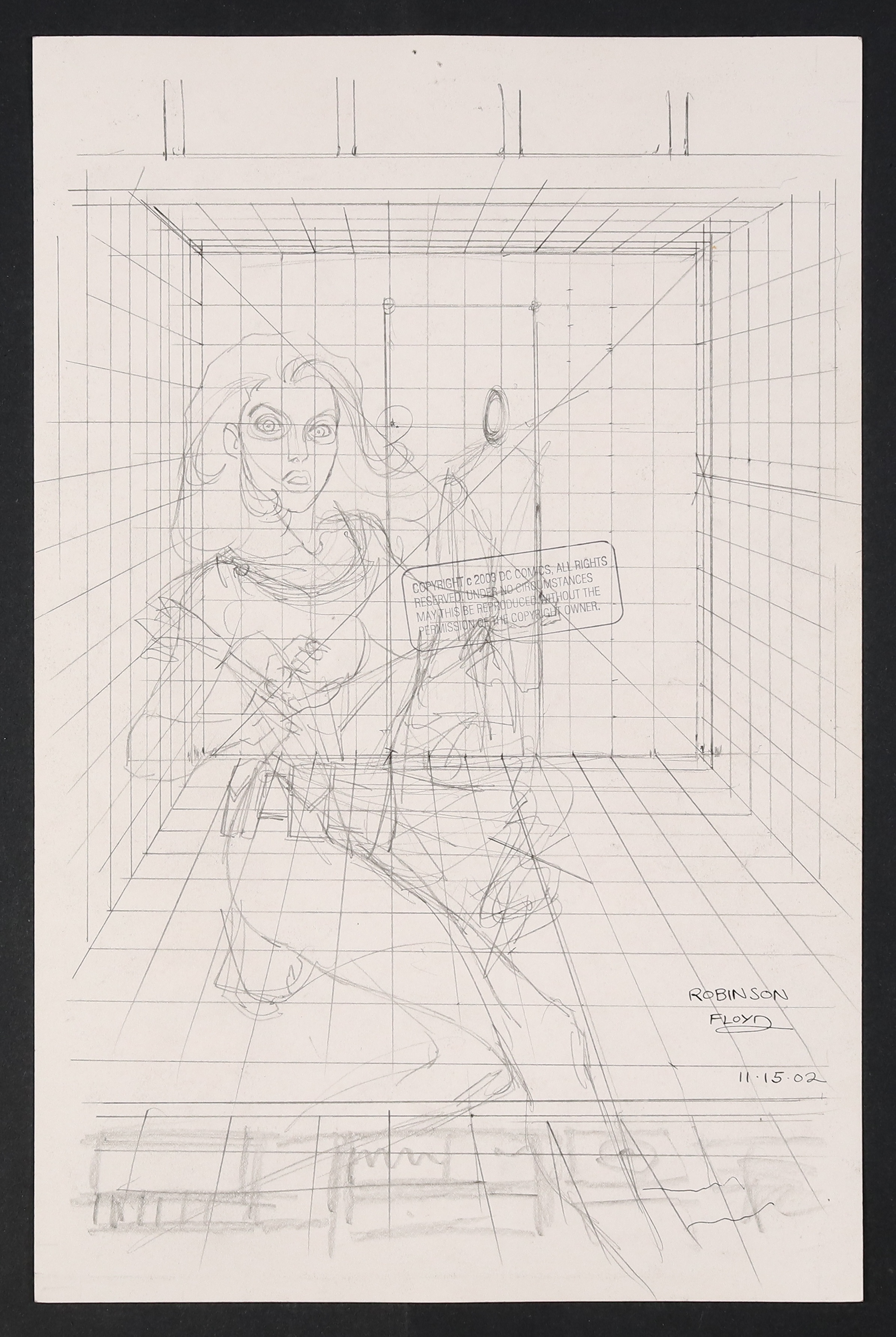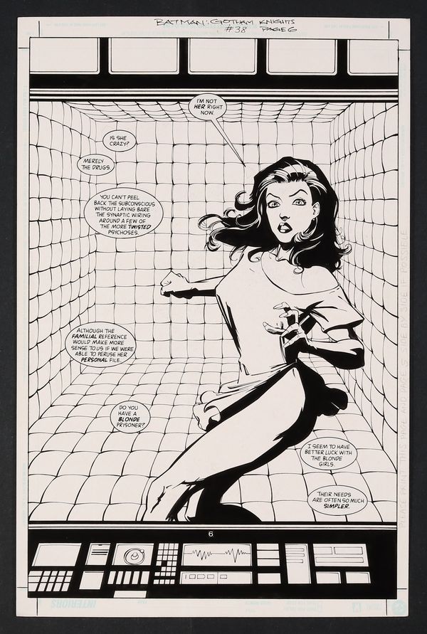 A great mirror to the title page that immediately precedes this page that saw Huntress in the exact same pose clad in the Bronze Age Huntress costume, here we get the reveal that she's actually locked in a padded cell and being monitored by someone with an affinity for blondes. Pencil and ink on DC Comics art board. 11 1/4" X 17".