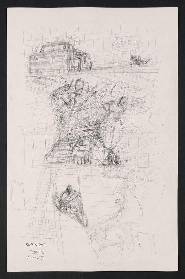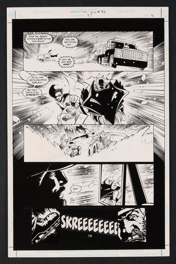 A great action page as Batman and Robin (Tim Drake) run down tow truck hauling a car according to Batman's GPS has a stray Batarang in it- possibly a bit of overkill considering the driver is just doing his job!. Pencil and ink on DC Comics art board. 11 1/4" X 17". NOTE: The two panels at the bottom of the page are pasted in stats.