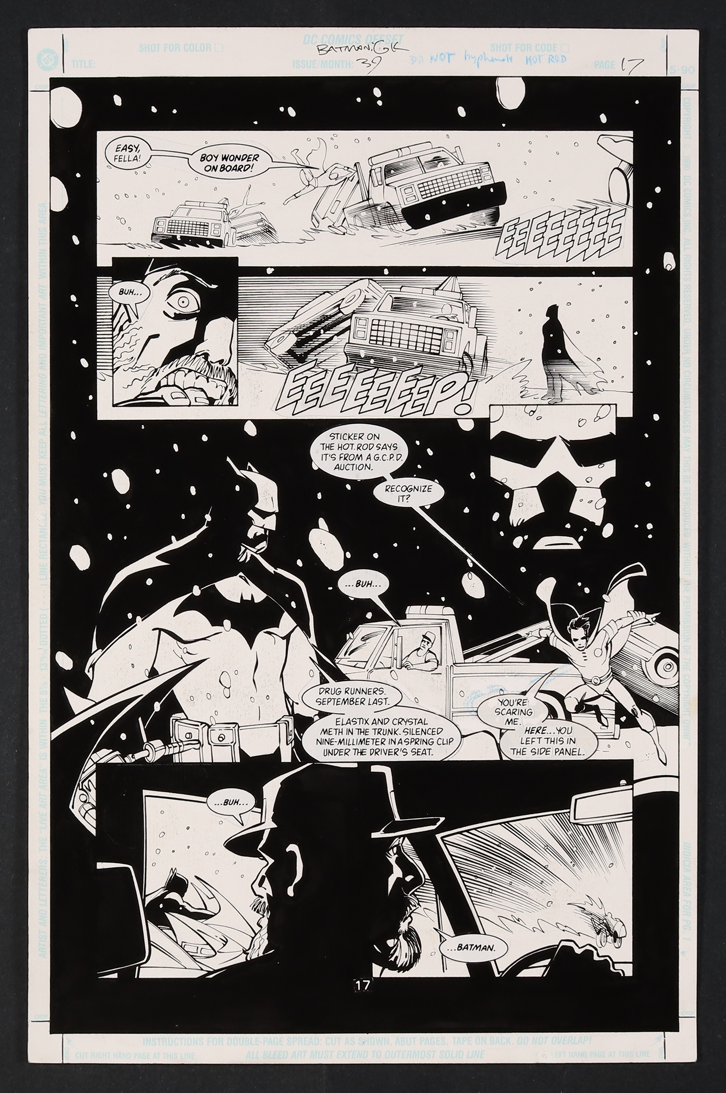 Following the GPS tracker embedded in a lost Batarang, Batman and Robin (Tim Drake) find it stuck in a car that had previously been used by drug runners but has since been auctioned off by the GCPD. Some great contrast and use of negative space on this page, giving the snowy scene a great sense of atmosphere. Pencil and ink on DC Comics art board. 11 1/4" X 17".