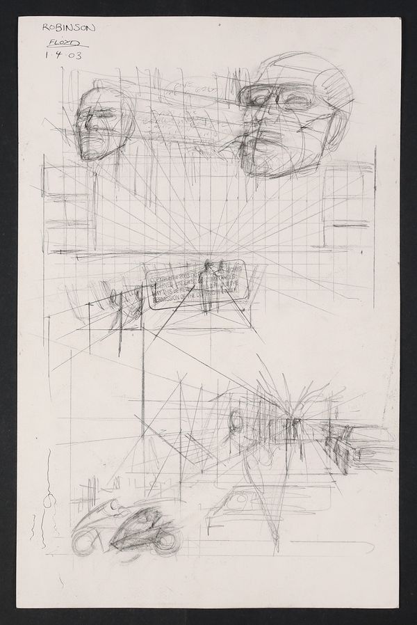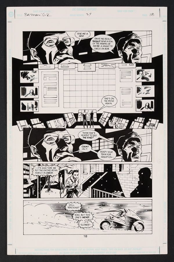 Storylines converge on this page as we see Checkmate tracking Helena Bertinelli, the Huntress, after her 'escape' from their facility while in the last panel, Batman and Robin continue to track down wayward Batarangs...once of which is in Helena's possession! Pencil and ink on DC Comics art board. 11 1/4" X 17".