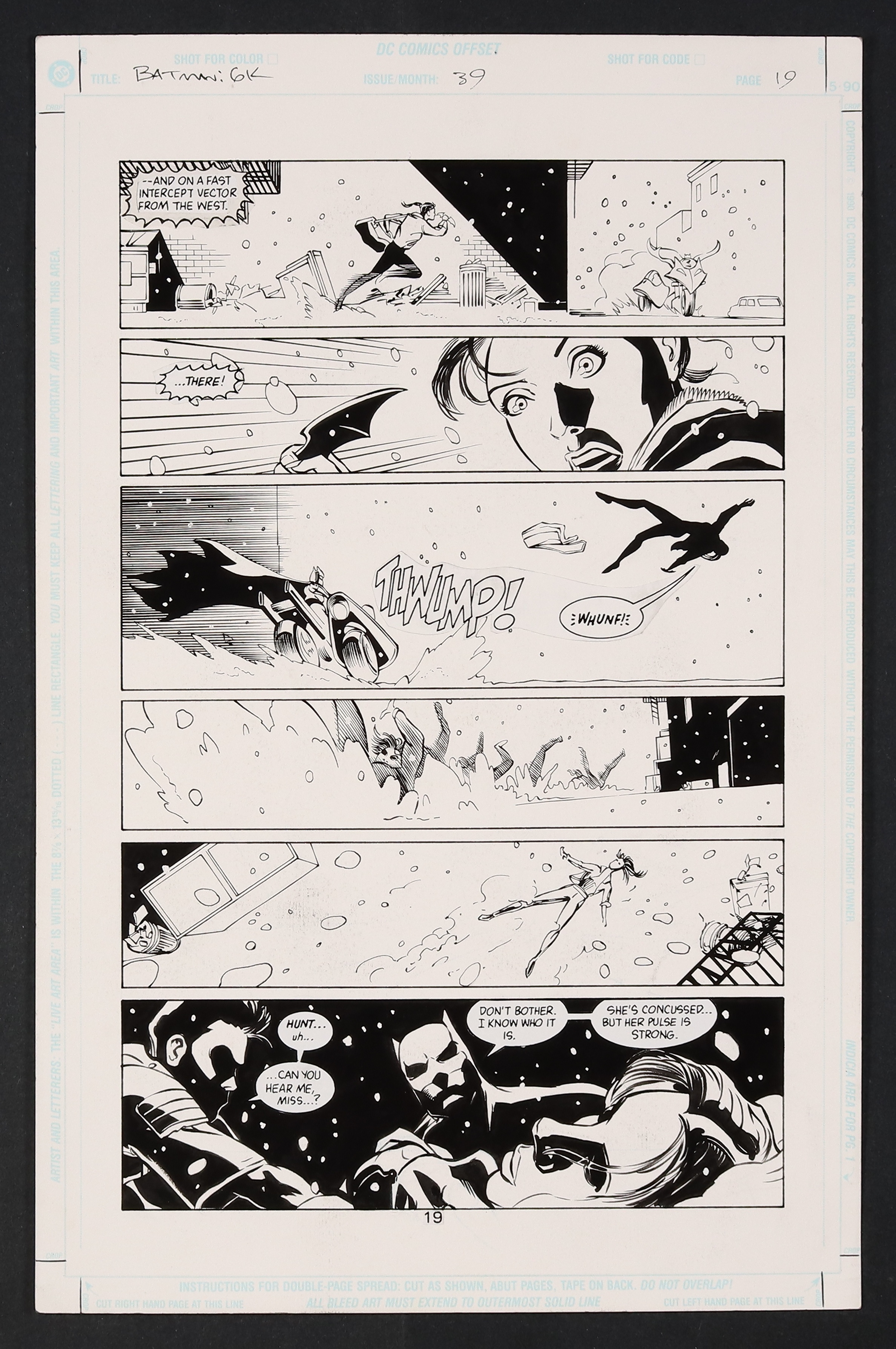 While Batman and Robin are spending their evening using GPS tracking to hunt down wayward Batarangs, Helena Bertinelli aka Huntress is on the run after escaping from a Checkmate facility and here they collide in spectacular fashion. Insurance is gonna have a heck of a time sorting this one out. Pencil and ink on DC Comics art board. 11 1/4" X 17".