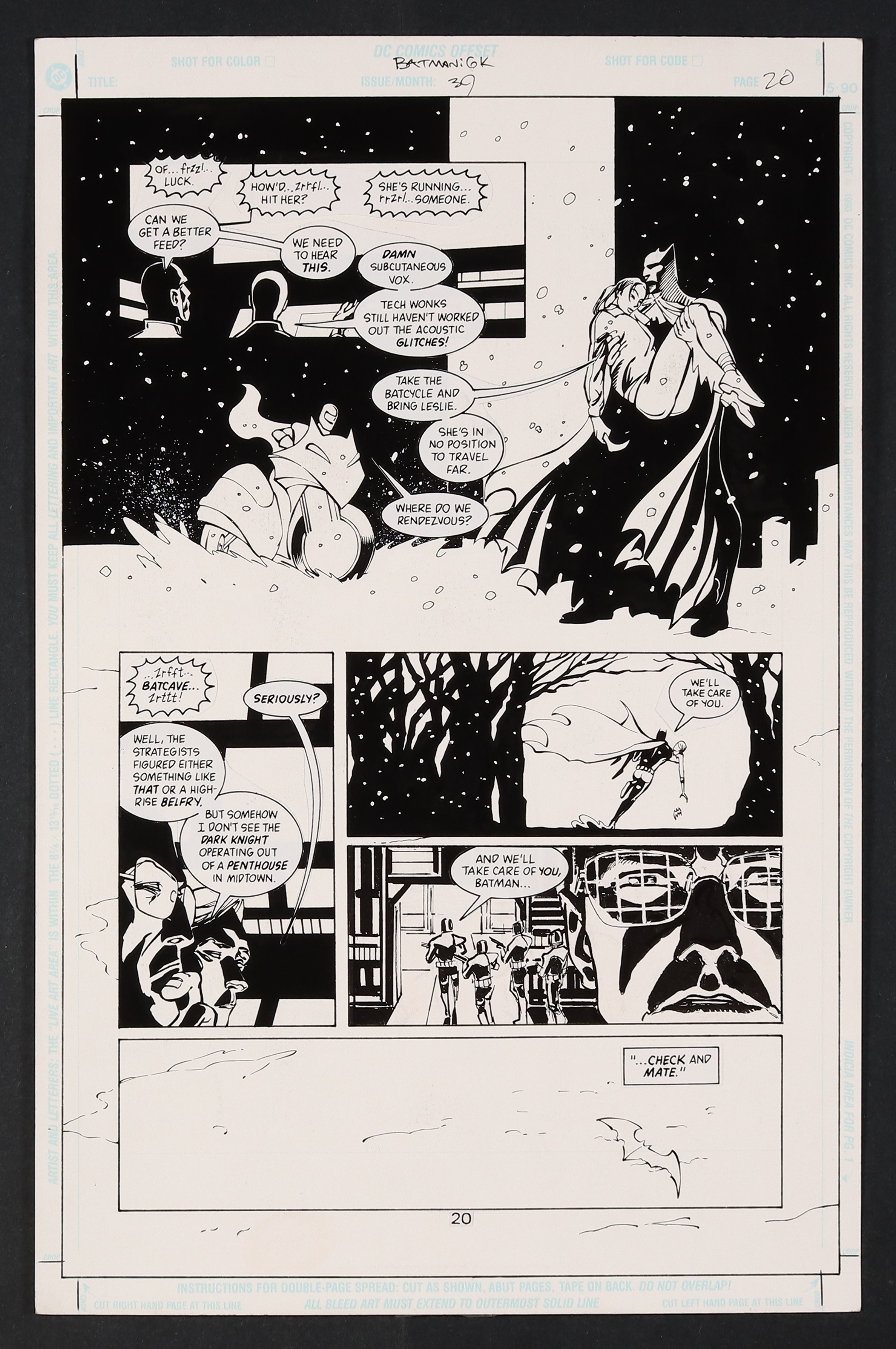 A striking, beautiful page that sees Batman and Robin (Tim Drake) rescuing a drugged and discombobulated Huntress who's just escaped from a Checkmate facility. What our heroes don't know however is that this was all part of Checkmate's plan and they're currently mobilizing to track down the Dark Knight! Pencil and ink on DC Comics art board. 11 1/4" X 17".