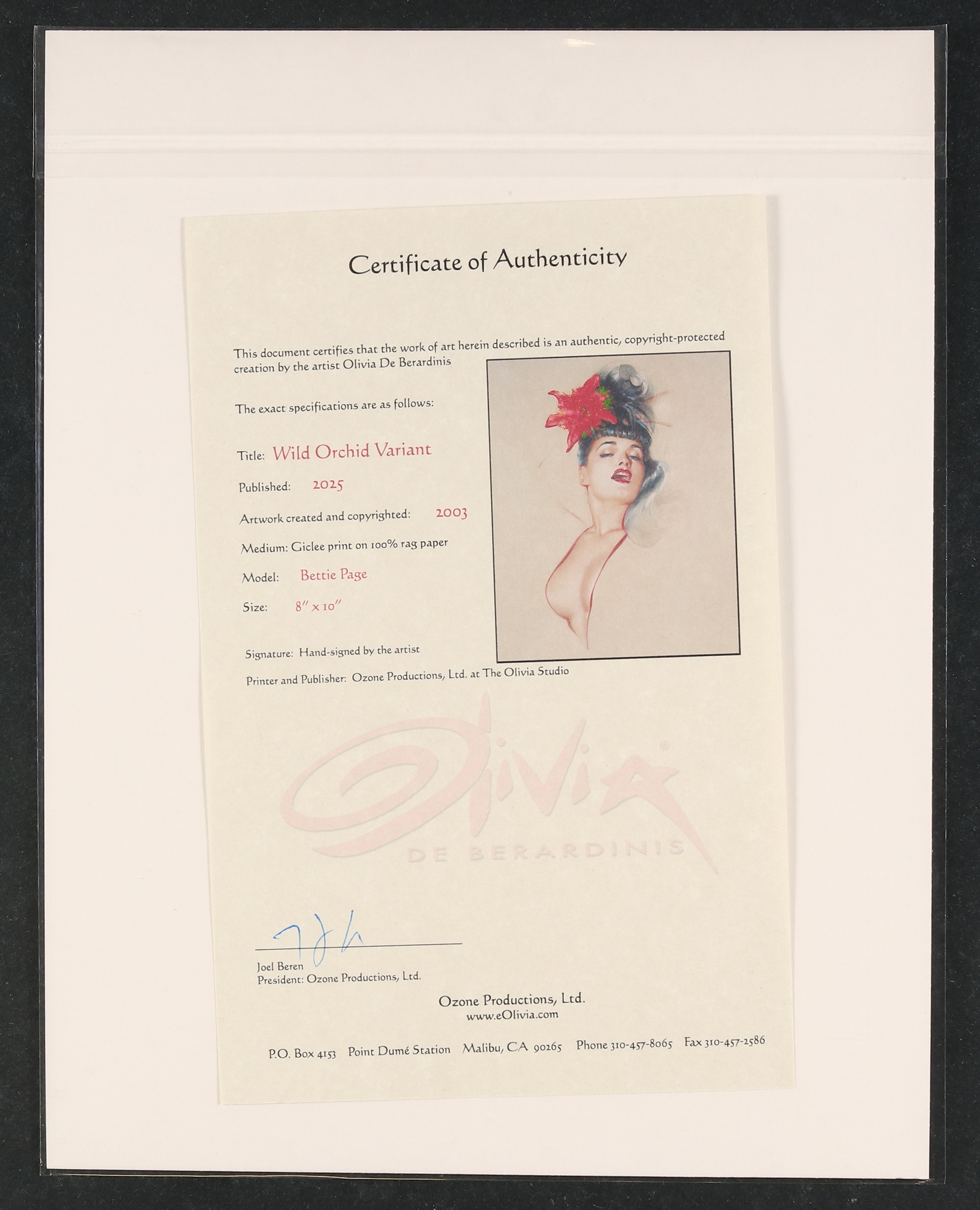 Signed by the artist. High quality giclée print on 100% rag paper. Includes certificate of authenticity from Ozone Productions. 8" x 10".