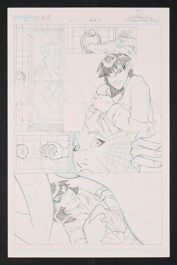 It's not all fun and games in the black ops espionage business- but it is a little bit! Taking a well-deserved shower after defeating a leprechaun terrorist in the sewers, Lark finds herself facing a new danger- Raven with a towel waiting to be snapped! Blue line and standard pencil on comic art board. 11" x 17".