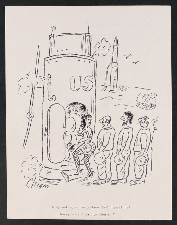 Chism was a prolific cartoonist, contributing mainly to Charlton's compilations including Good Humor and Cartoon Carnival. Signed by the artist. Pencil and ink on paper with a custom stamp from Chism on the reverse. 8 1/2" x 11"