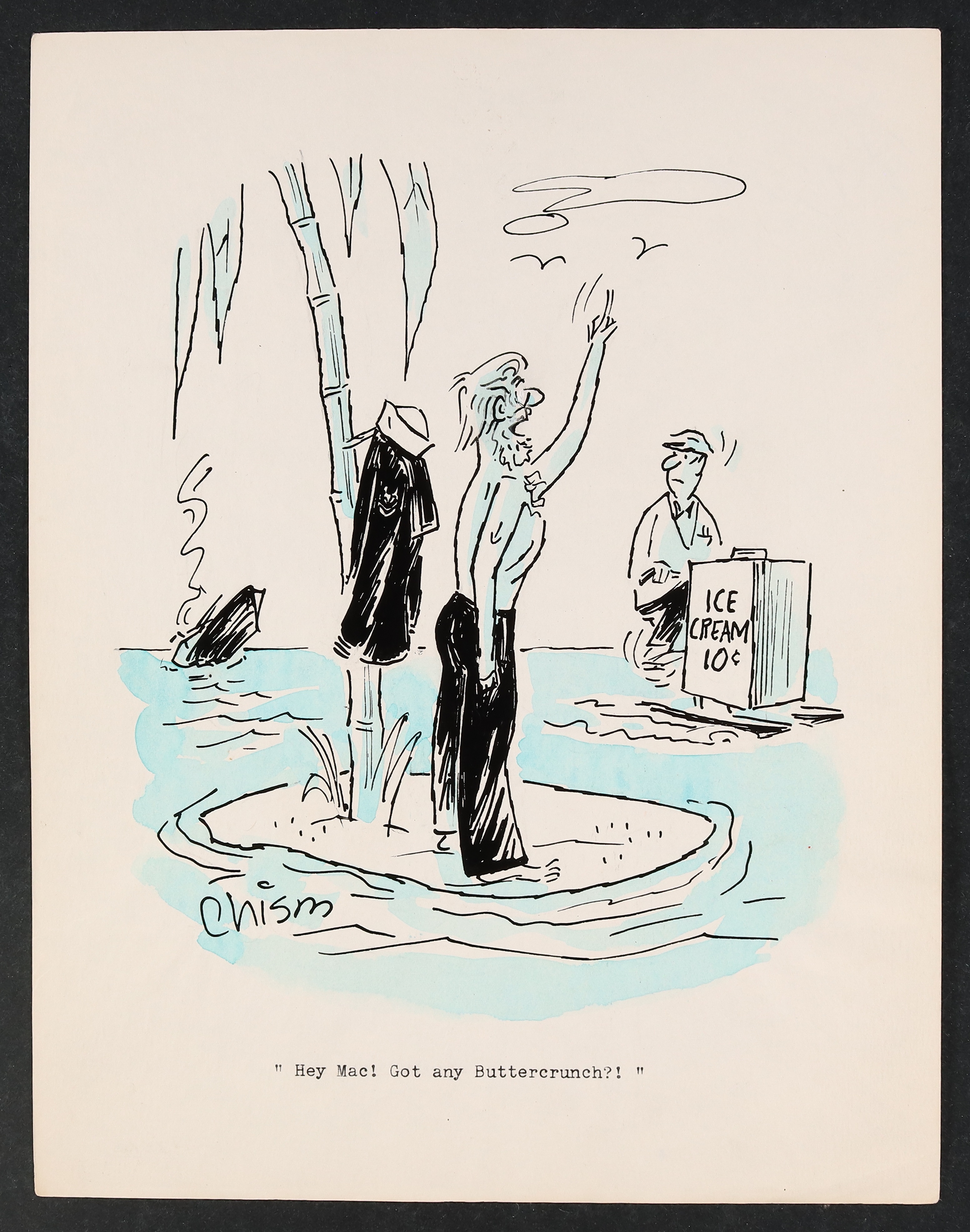 Chism was a prolific cartoonist, contributing mainly to Charlton's compilations including Good Humor and Cartoon Carnival. Signed by the artist. Pencil and ink with watercolor on paper with a custom stamp from Chism on the reverse. 8 1/2" x 11"