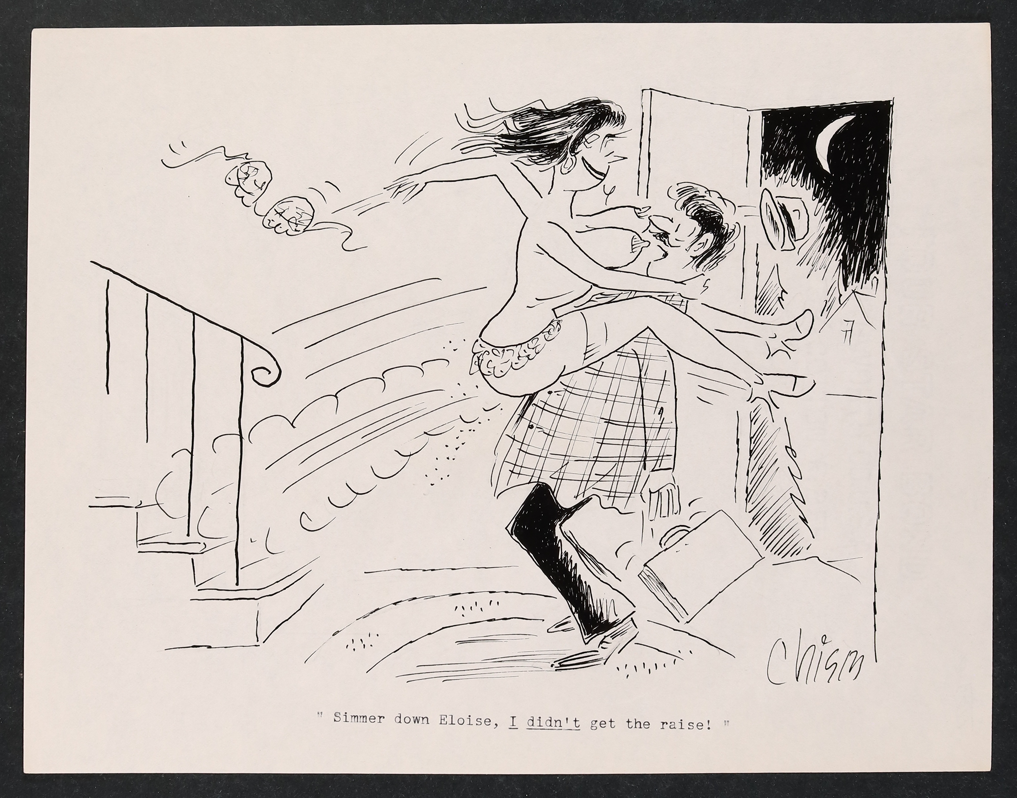 Chism was a prolific cartoonist, contributing mainly to Charlton's compilations including Good Humor and Cartoon Carnival. Signed by the artist. Pencil and ink on paper with a custom stamp from Chism on the reverse. 8 1/2" x 11"
