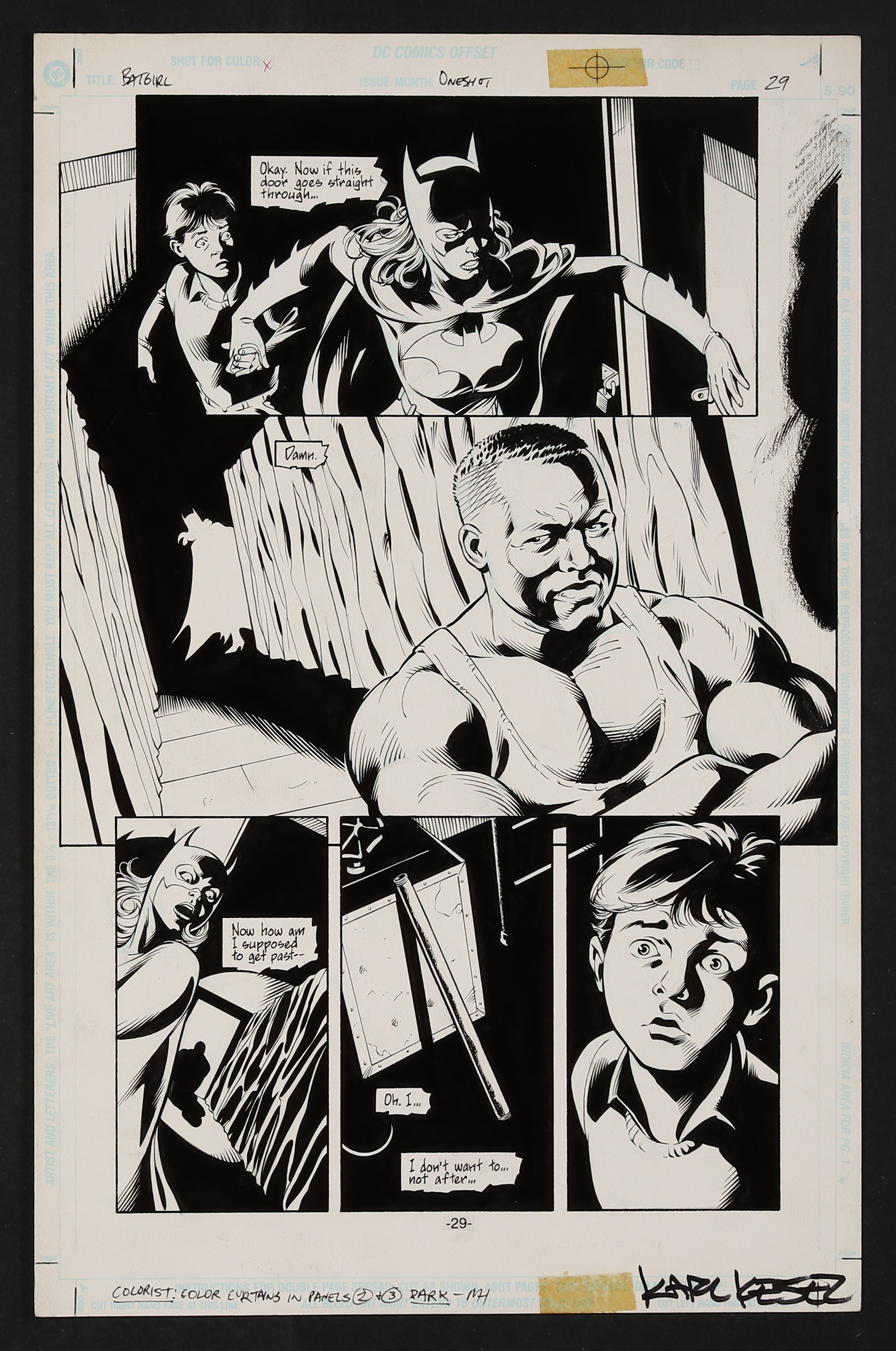 Coinciding with Batgirl's big screen debut in Batman & Robin, this one shot took place early in Barbara's career and told the story of her first encounter with the Joker- which has gone horrifyingly awry. After accidentally killing a thug attempting to take a family hostage and being knocked out by the Joker, Batgirl attempts to lead the only other survivor of the attack to safety. Signed by Kesel in lower margin. Pencil and ink on DC Comics art board. 11" x 17".