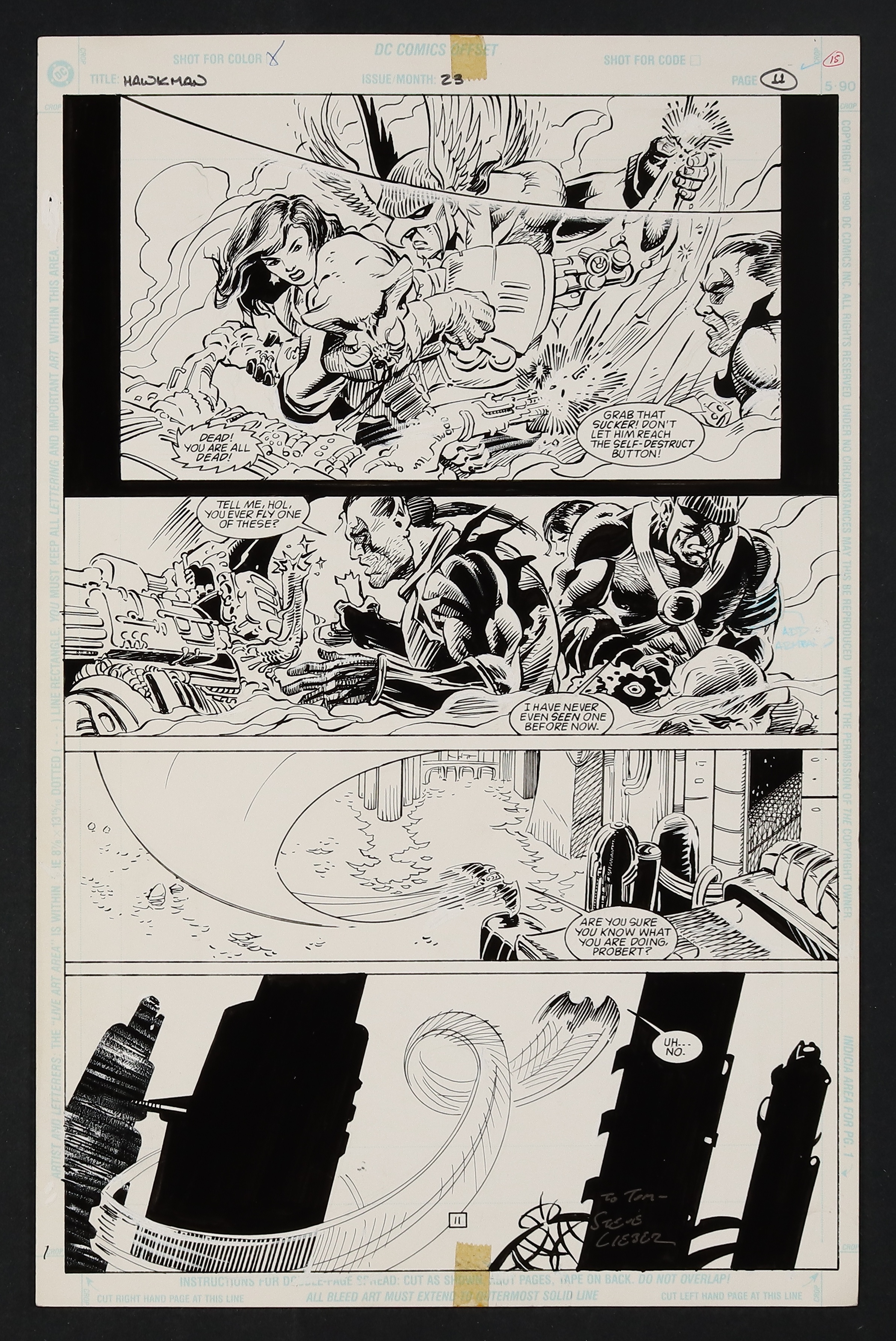 It's an intergalactic rescue mission as Hawkman and other Justice Leaguers assault the Tormock homeworld to save Guy Gardner! This beautifully inked page sees Hawkman, Wonder Woman, and Probert (a mercenary who managed to snag some Green Lantern powers!) commandeering a Tormock ship. Signed by Lieber in last panel. Pencil and ink on DC Comics art board. 11" x 17".