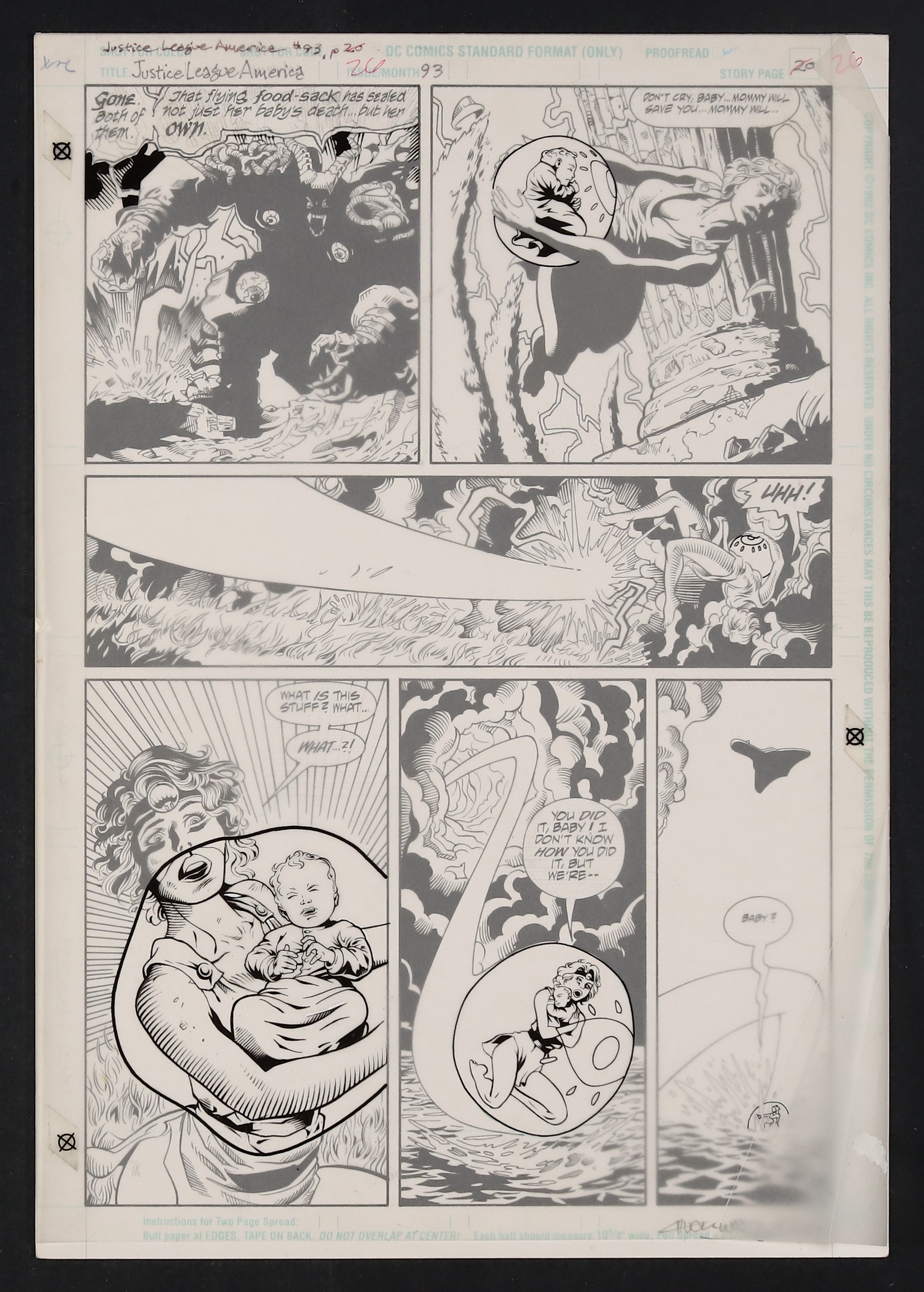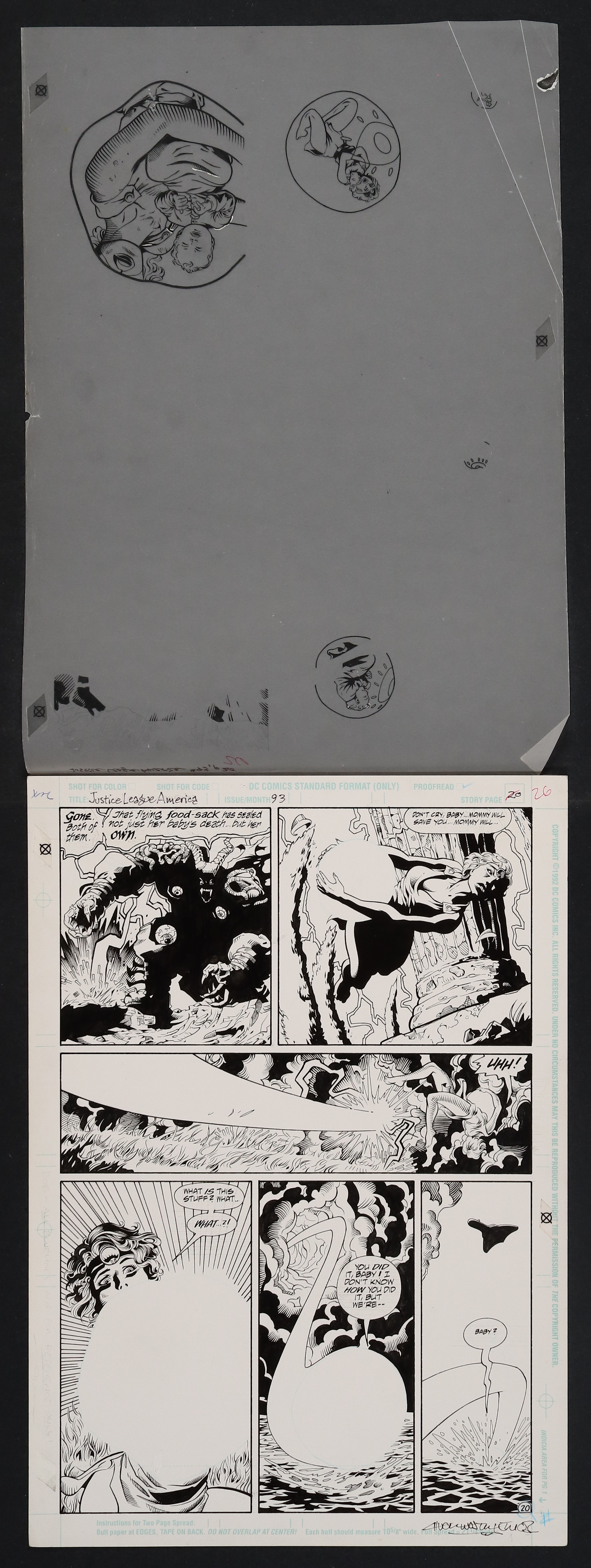 A surprise attack from the horrific Scarabus has the League reeling- though his true target is Power Girl's newborn son! Thankfully, it's revealed here that the child possesses powers of his own as he forms a force field to save himself and his mother-though their final destination of Atlantis will likely bring some more challenges! Signed by Wojtkiewicz in lower margin. Pencil and ink on DC Comics art board with vellum overlay that has additional art. 11 1/2" x 16 1/2".