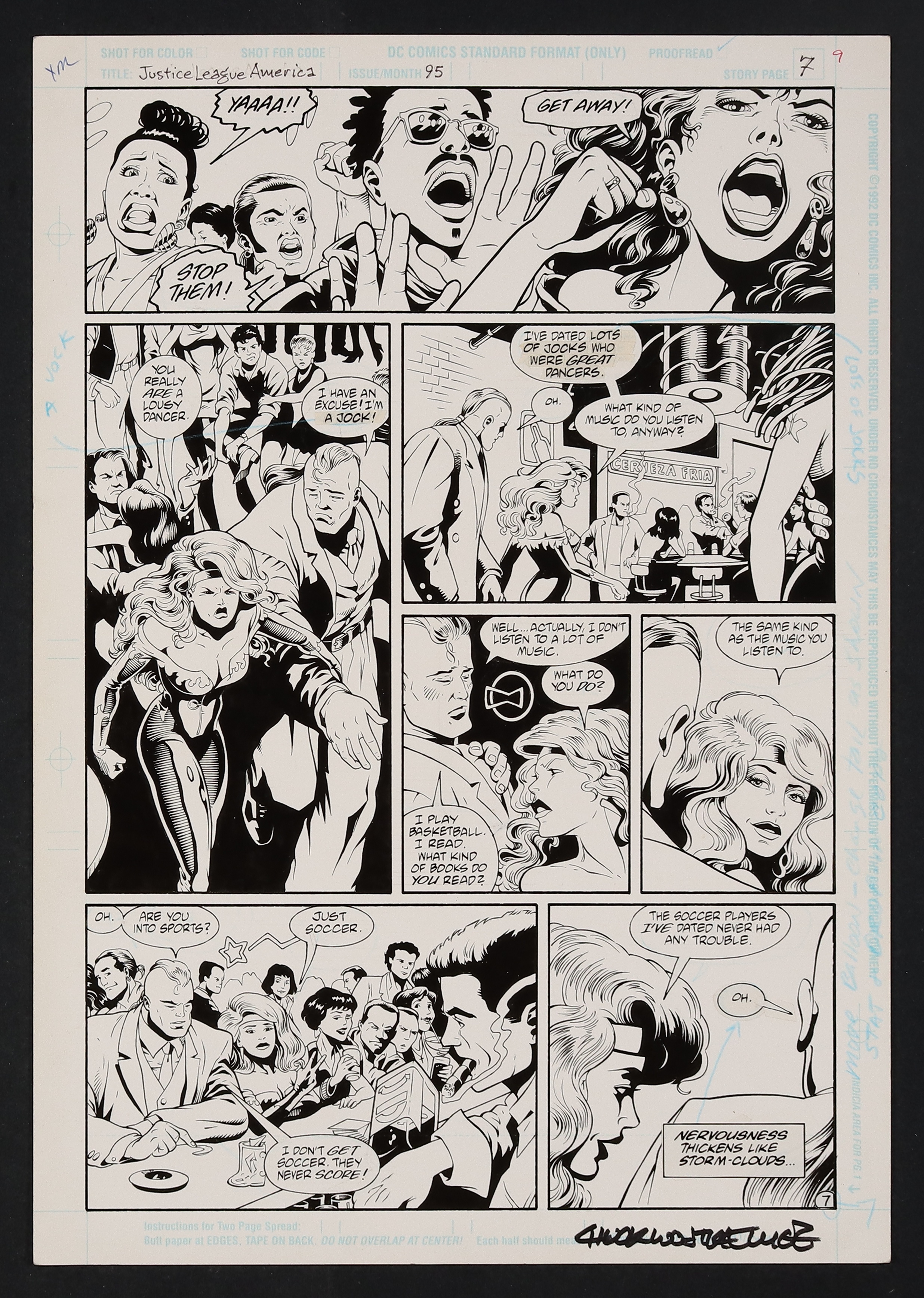 It may not seem so at a glance, but this is a terrifying page! Imagine scoring a date with a Brazilian model/superhero and hitting the club for a night on the town only to be chased off the dancefloor by an angry mob who hates your moves and THEN you find out there's no chemistry with your date. This is the reality for Albert Rothstein (aka Nuklon) on this fantastically drawn page that perfectly captures the sitcom-esque appeal of this era of the League. Signed by Wojtkiewicz in lower margin. Pencil and ink on DC Comics art board. 11 1/2" x 16 1/2". NOTE: Multiple inkers are credited for this issue- Bob Dvorak, Rich Rankin.