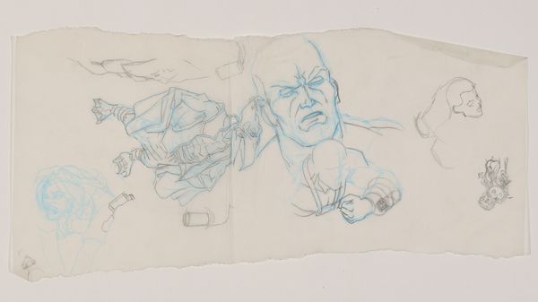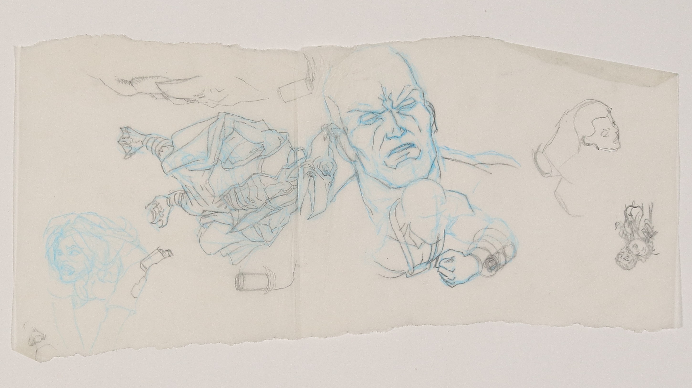 The League has been adjusting to their new base of operations on the Overmaster's former ship, though the fact that it's still inhabited is a bit of a hiccup! Thankfully, some help from future JLA ally Yazz convinces most of the aliens to call of their attack...most. Also included with this page is a piece of vellum with various sketches by Wojtkiewicz- including one of Yazz, likely as part of his first appearance in this issue. Signed by Wojtkiewicz in lower right margin. Pencil and ink on DC Comics art board. 11 1/2" x 16 1/2".