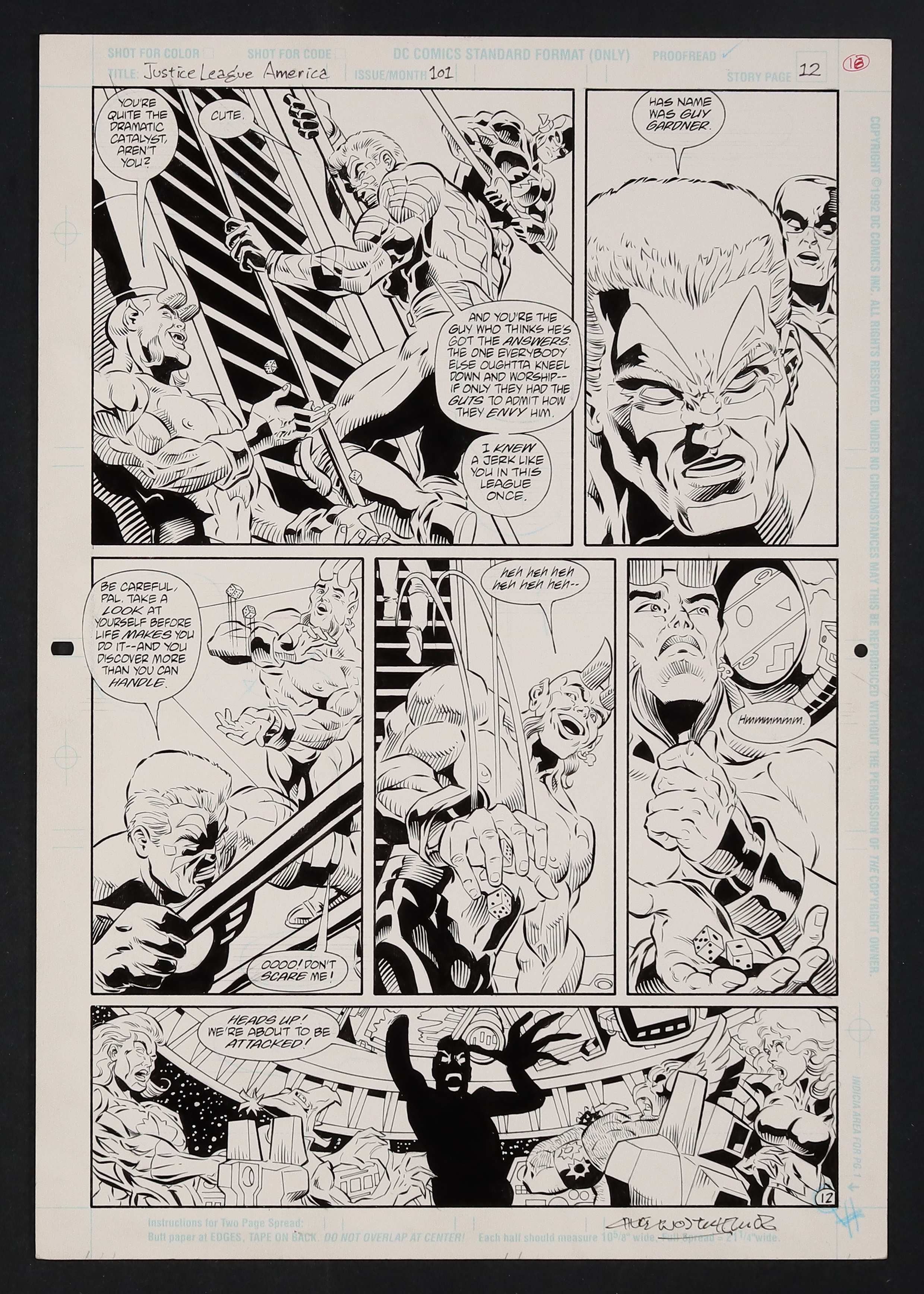 Tensions are high in the League as they rocket towards an alien army bent on invading earth, thanks in no small part to Blue Devil's flippant attitude towards the danger they face. A great character moment on this page as Devil gets some advice from the League's former "jerk", Guy Gardner. Signed by Wojtkiewicz in lower margin. Pencil and ink on DC Comics art board. 11 1/2" x 16 1/2".