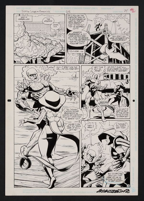 While the majority of the League is in space trying to stop an invasion of Earth, Metamorpho and Crimson Fox are on a much more personal mission- tracking down the assassin who killed the previous Crimson Fox. Some great shots of both heroes here showing off the excellent character designs. Signed by Wojtkiewicz in lower margin. Pencil and ink on DC Comics art board. 11 1/2" x 16 1/2".