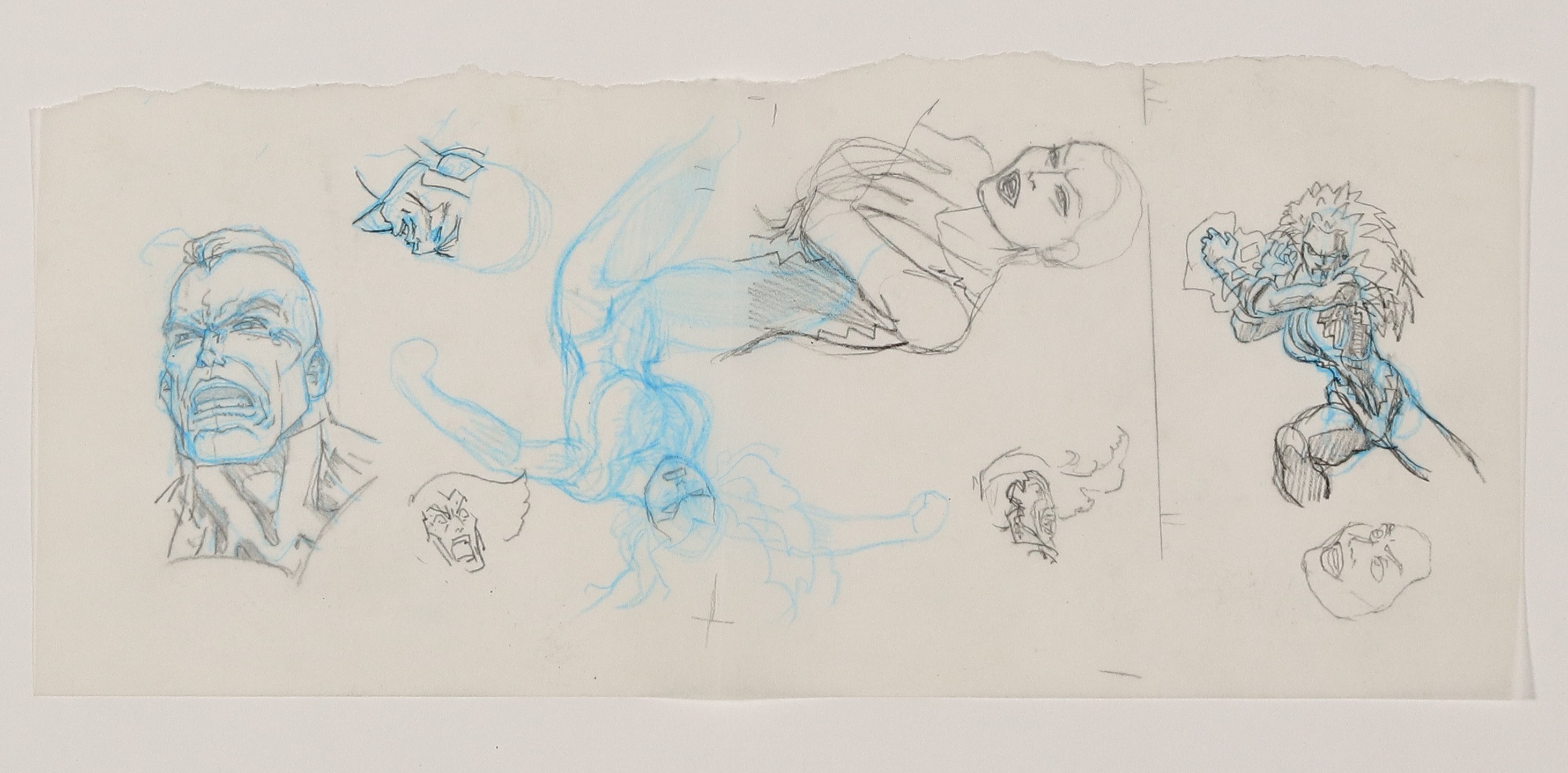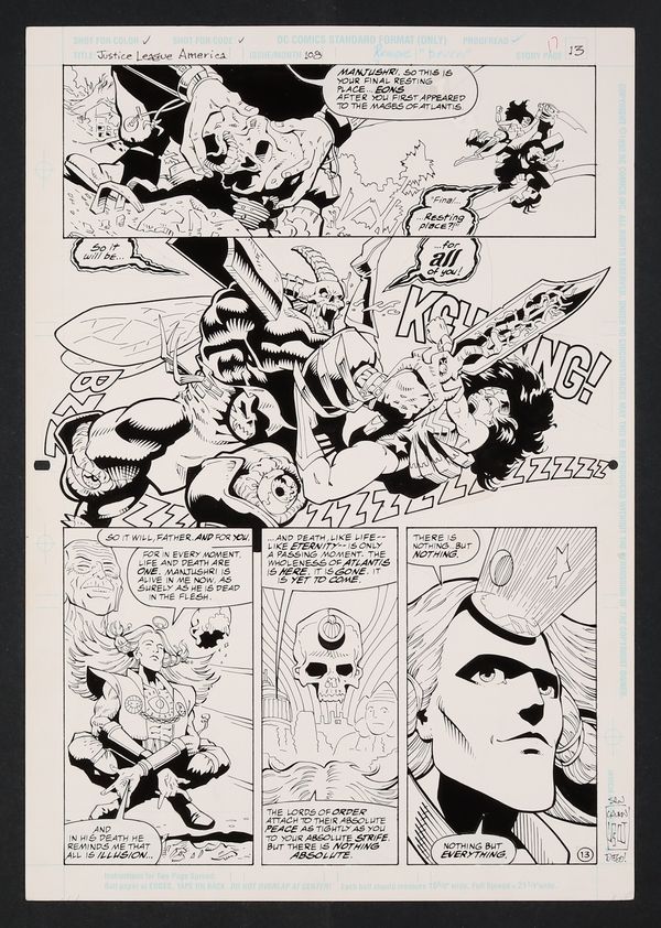 A battle long in the making, Scarabus is finally having it out with the League- and Power Girl's infant son who has suddenly become a full grown adult man named Equinox! A great fight panel between Scarabus and Wonder Woman stands out here showing off the villain's delightfully creepy design. Also included with this page is a piece of vellum with various sketches by Wojtkiewicz. Signed by Wojtkiewicz in lower right margin. Pencil and ink on DC Comics art board. 11 1/2" x 16 1/2".