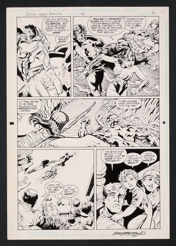 A page full of heroes! With the JLA's base on The Refuge in "Purge Mode", the heroes not on the ship race to rescue their allies. Great shots of Green Lantern, Wonder Woman, and Flash here as they head off into space! Signed by Wojtkiewicz in lower margin. Pencil, ink, and screentone on DC Comics art board. 11 1/2" x 16 1/2".