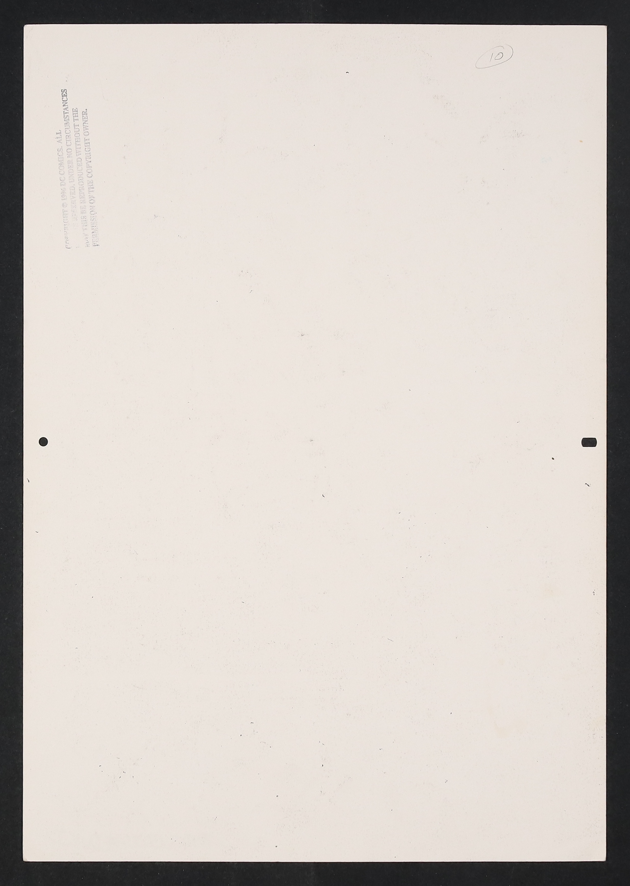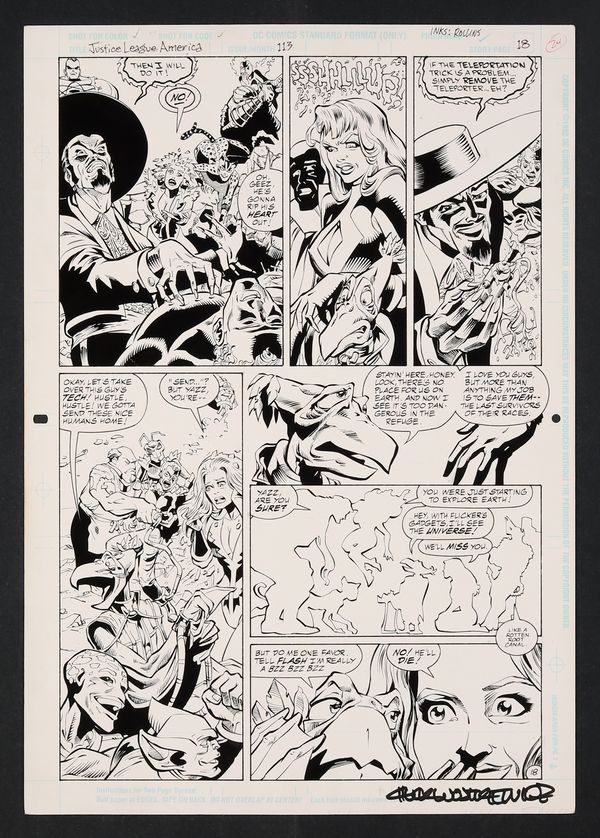 Freed from intergalactic slaver Flicker by Power Girl's rage, the JLA prepares to head back to earth to end their final adventure together. Some great touches on this page from the hand-drawn onomatopoeia of El Diablo removing the teleporter from Flicker's body, to the silhouette of the team saying goodbye to Yazz. Signed by Wojtkiewicz in lower margin. Pencil, ink, and screentone on DC Comics art board. 11 1/2" x 16 1/2".
