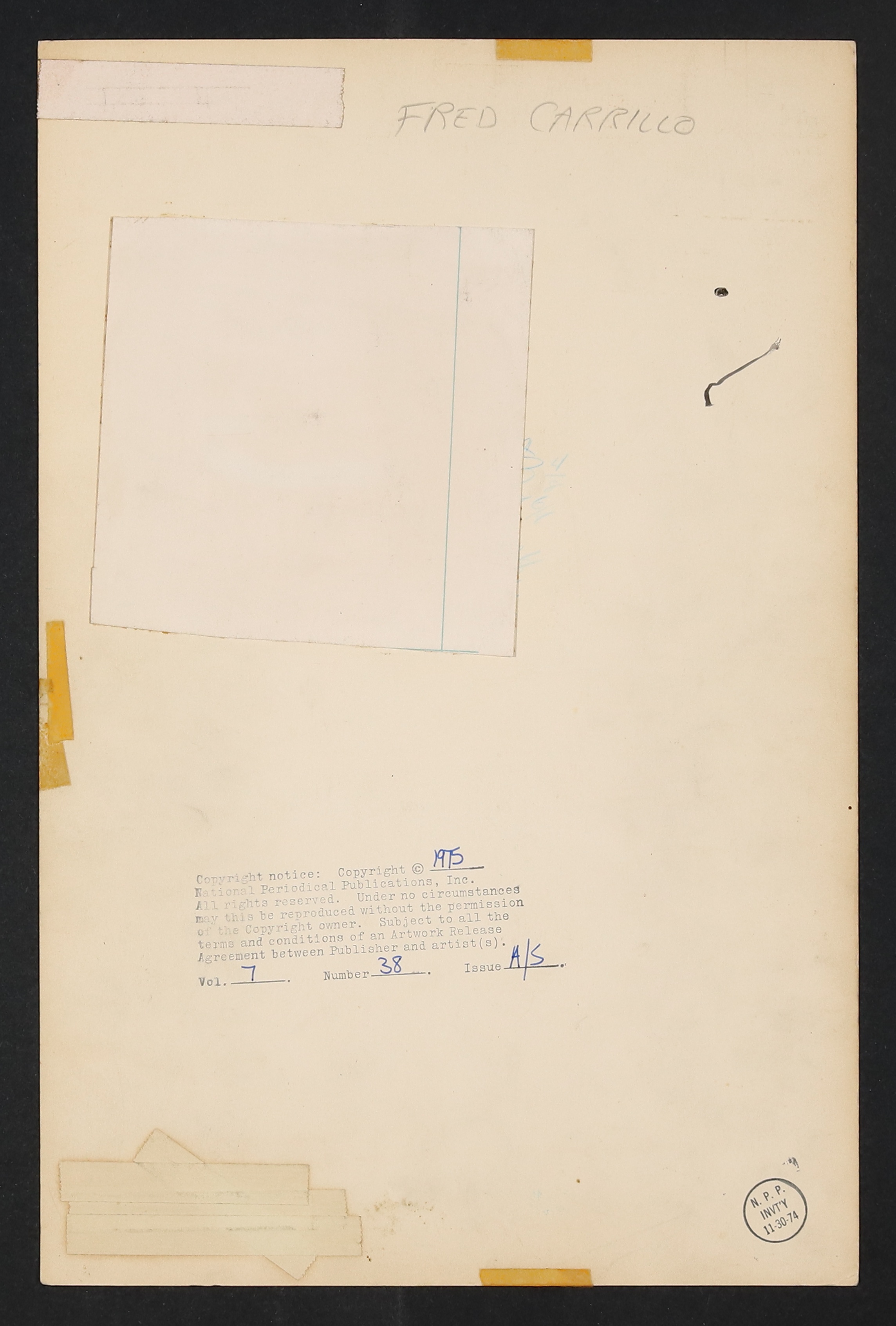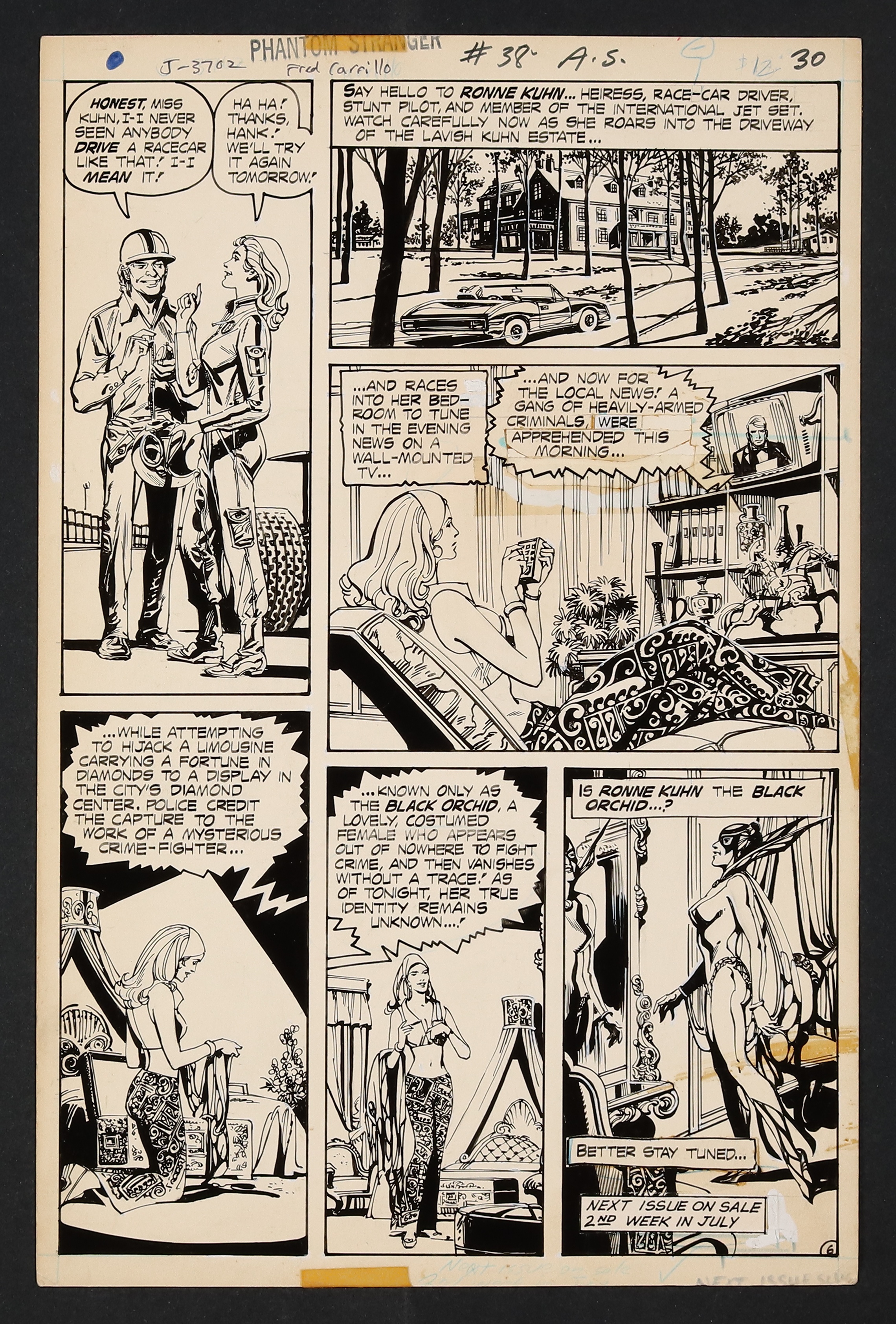 The final page to this Black Orchid backup story just might reveal the mystery behind the heroine's identity as "Heiress, Race-Car Driver, Stunt Pilot, and member of the international jet set" Ronnie Kuhn dons the Black Orchid's costume. To save you a Google, no, this is not the true identity of the Black Orchid, but who can complain when the art is this gorgeous? Carillo delivers a lush, detailed page with beautiful figure work and great design- especially on that racing suit. Pencil and ink on art board. 10 1/2" x 16". NOTE: A portion of the dialogue in the third panel is pasted in and affixed with tape on the front and clue on back.