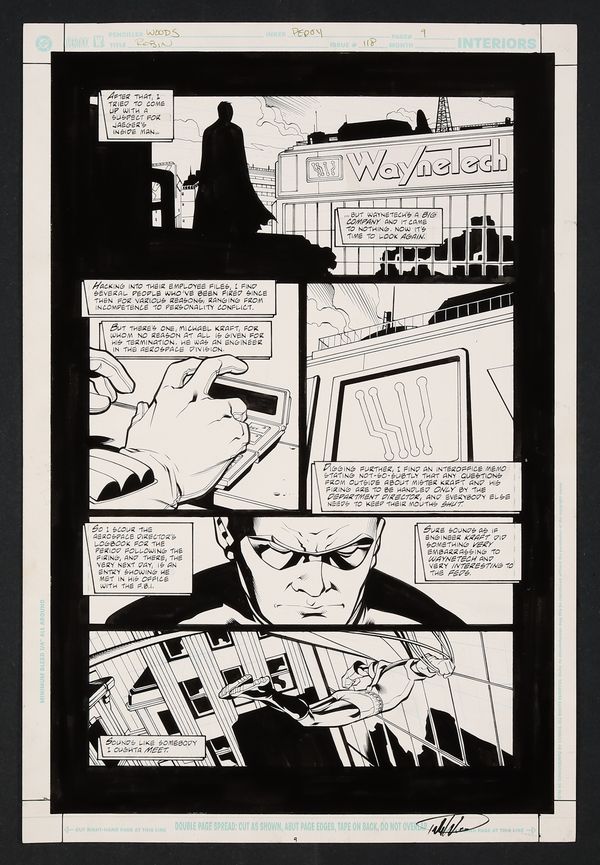 Worried that he's being tracked by the villain Jaeger and that his secret identity is compromised, Robin goes on the offensive and begins hunting right back! Some classic Gotham vigilante imagery here with Robin in silhouette looking out at a Waynetech building and a great final panel of the Boy Wonder diving into the city. Signed by Woods in lower margin. Pencil and ink on DC Comics art board. 11 1/2" x 17".