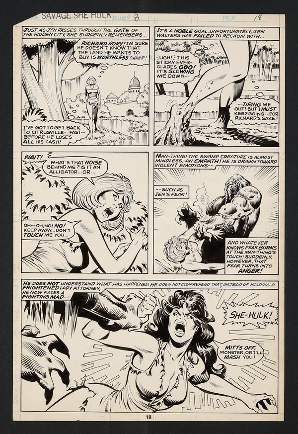 An absolutely fantastic Shulkie page featuring the Man-Thing! Captured by a mysterious pair of beings and taken to a hidden city built around the fountain of youth that also flattened human emotion, Jen Walters used her legal know-how to convince the society that what they had wasn't truly living. Expelled from the secret hideway, she wanders the swamps of Florida only to find herself in the clutches of the Man-Thing. While Jennifer Walters may know fear, the Savage She-Hulk does not and some green on green violence is imminent! Pencil and ink on Marvel Comics art board. 10 1/2" x 15 3/4".