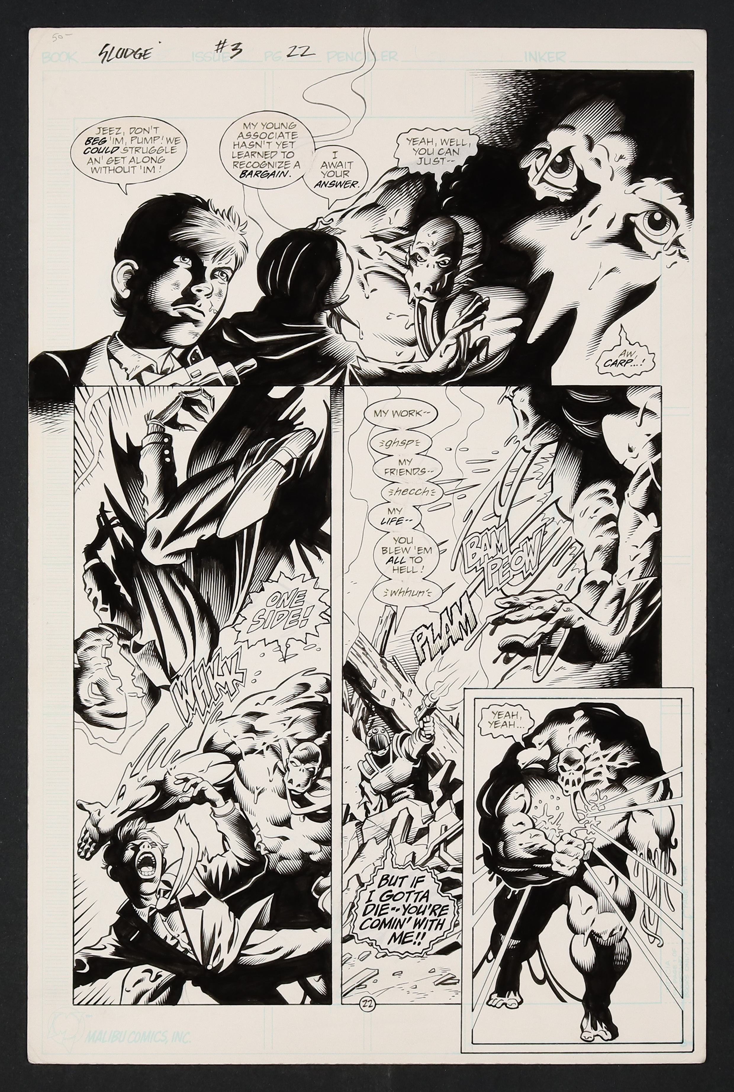 A bold action page featuring the Ultraverse's gooiest character! Sludge has had a rough day and it's not getting any easier as he's caught between crime boss Lord Pump and a very well-armed rival gang. While Sludge consider's Pump's offer, the rival gang attacks necessitating some quick thinking from Sludge. Pencil and ink on Malibu Comics art board. 11 1/2" x 17 1/2".